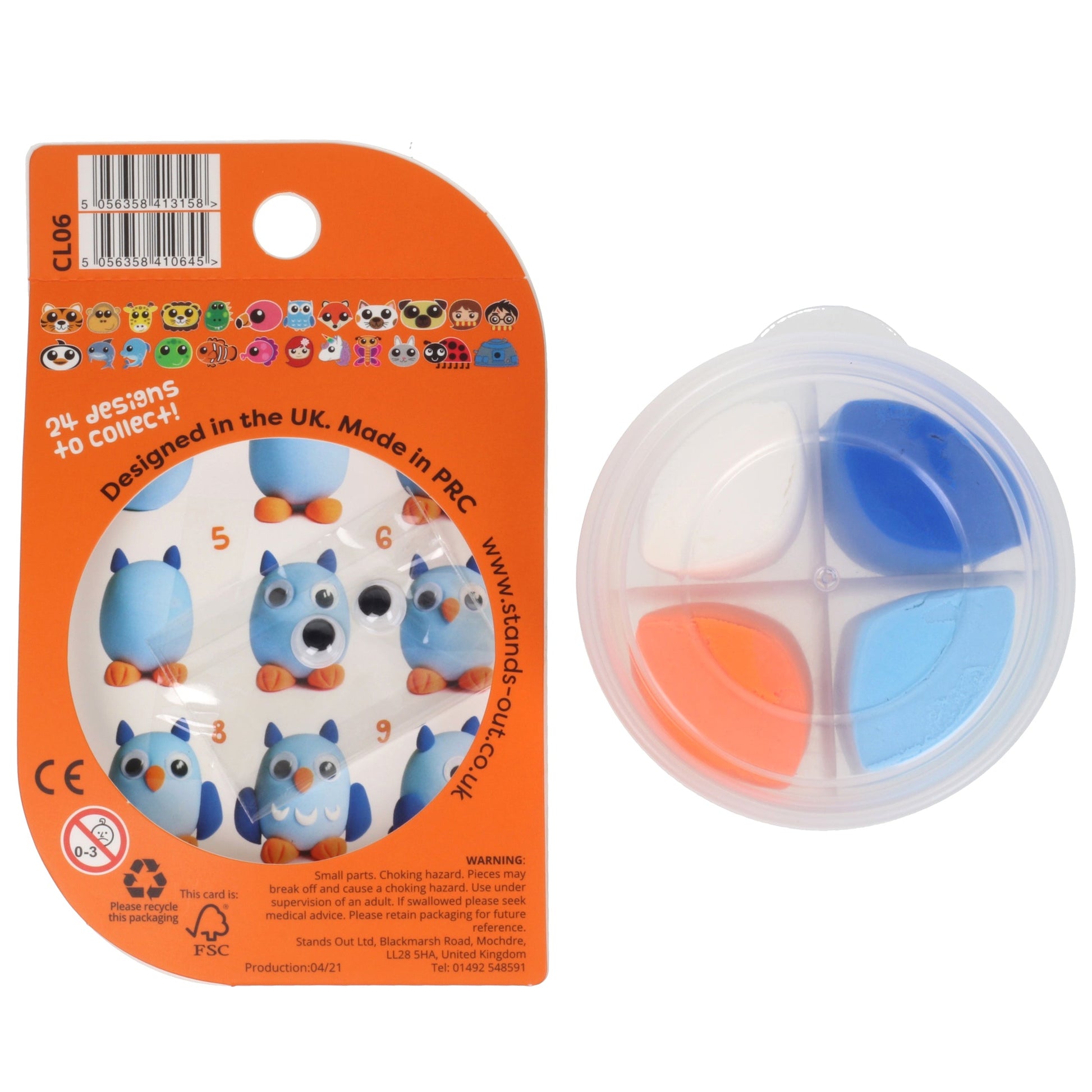 Each pot comes with 4 sections of soft squidgy polymer clay with enough colours to create your Owl character.