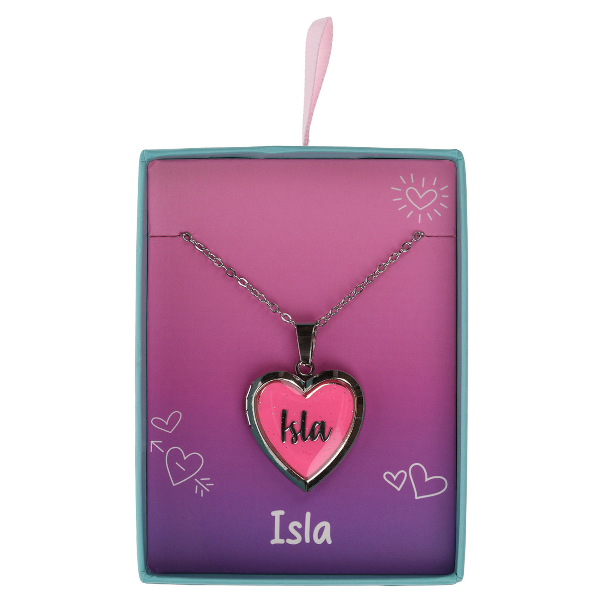 This stunning pink glow-in-the-dark locket hangs from a silver-coloured chain and is personalised with 'Isla'. It opens to hold a photo inside and comes beautifully presented in a colourful gift box, which includes the personalised name. A unique keepsake, it makes a perfect gift or a stylish addition to any outfit.