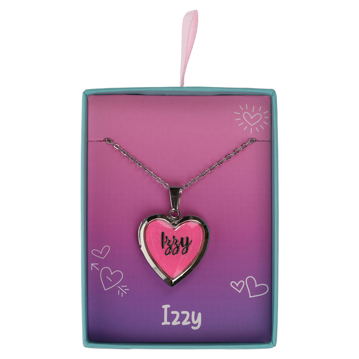 This stunning pink glow-in-the-dark locket hangs from a silver-coloured chain and is personalised with 'Izzy'. It opens to hold a photo inside and comes beautifully presented in a colourful gift box, which includes the personalised name. A unique keepsake, it makes a perfect gift or a stylish addition to any outfit.