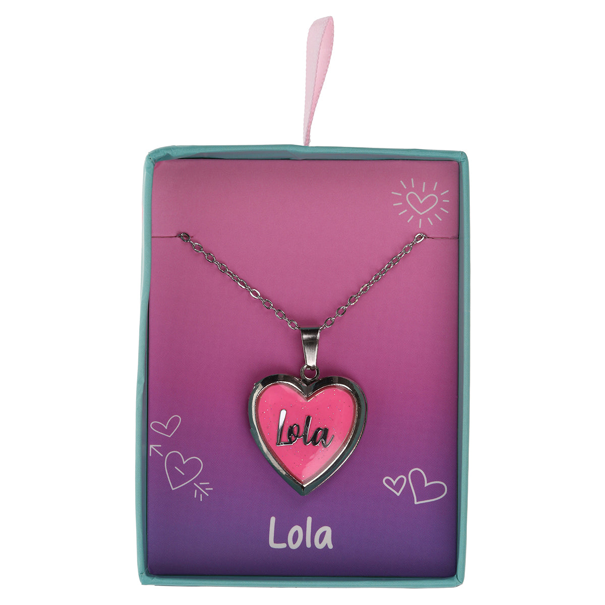 This stunning pink glow-in-the-dark locket hangs from a silver-coloured chain and is personalised with 'Lola'. It opens to hold a photo inside and comes beautifully presented in a colourful gift box, which includes the personalised name. A unique keepsake, it makes a perfect gift or a stylish addition to any outfit.