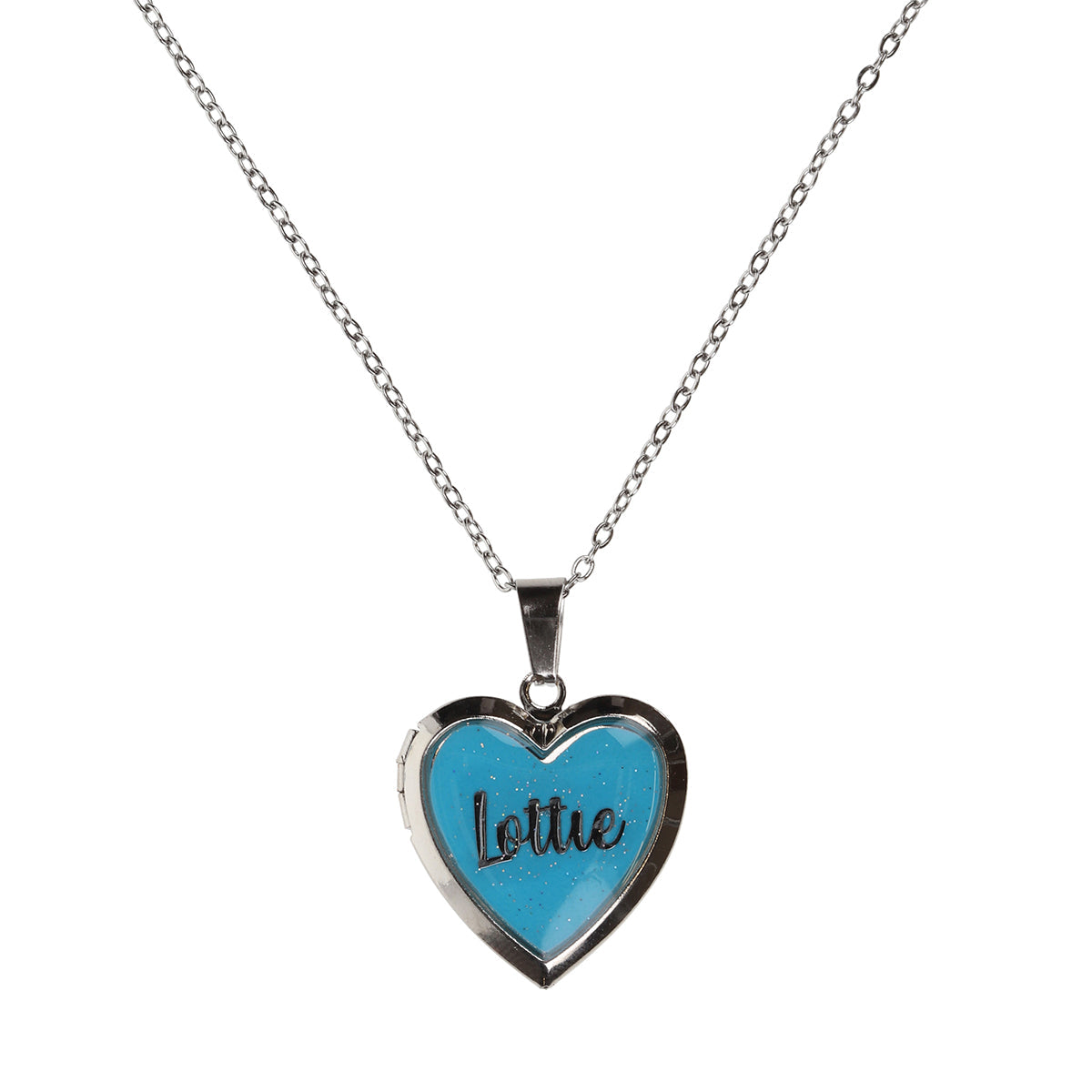 This stunning blue glow-in-the-dark locket hangs from a silver-coloured chain and is personalised with 'Lottie'. It opens to hold a photo inside and comes beautifully presented in a colourful gift box, which includes the personalised name. A unique keepsake, it makes a perfect gift or a stylish addition to any outfit.