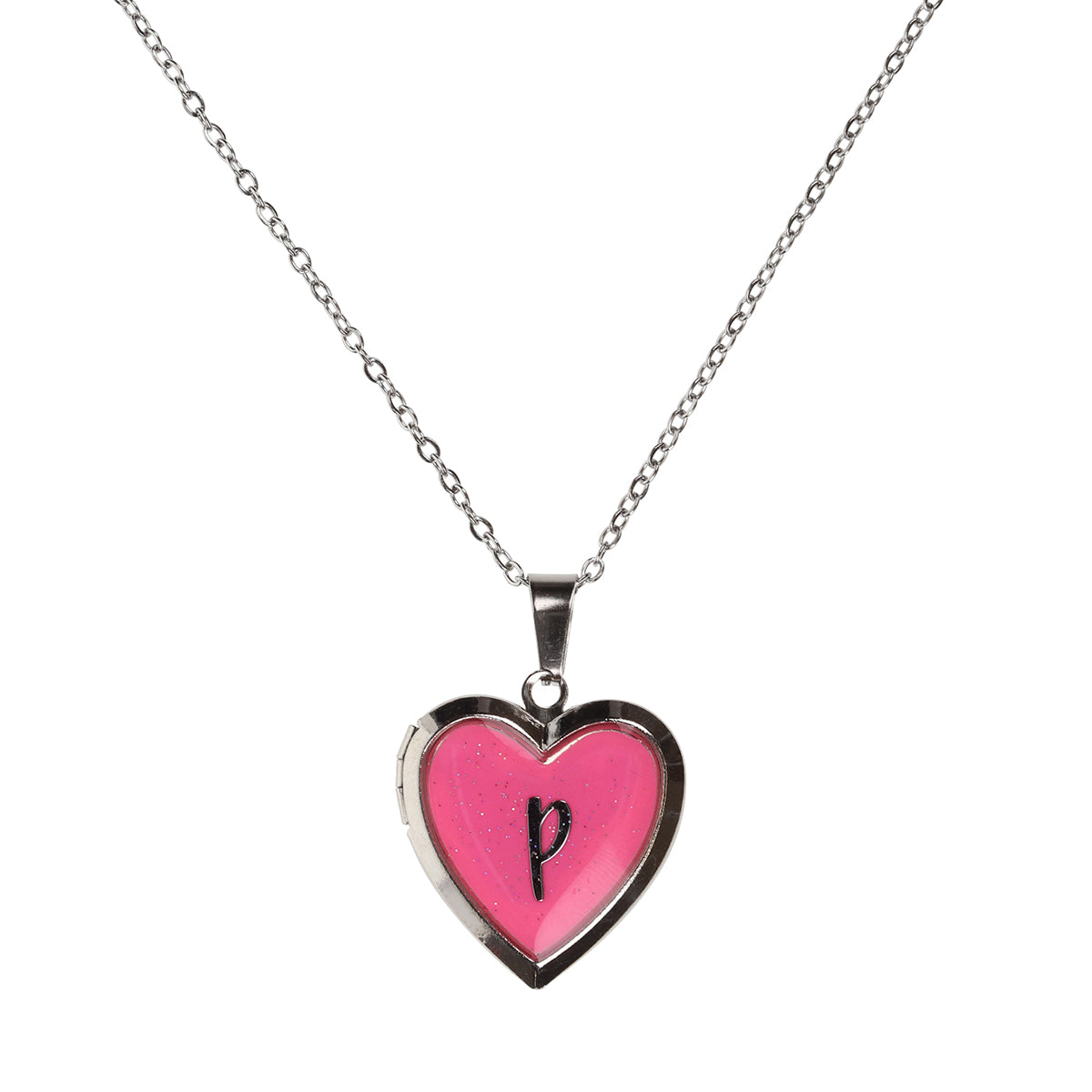 This stunning pink glow-in-the-dark locket hangs from a silver-coloured chain and is personalised with 'P'. It opens to hold a photo inside and comes beautifully presented in a colourful gift box, which includes the personalised name. A unique keepsake, it makes a perfect gift or a stylish addition to any outfit.