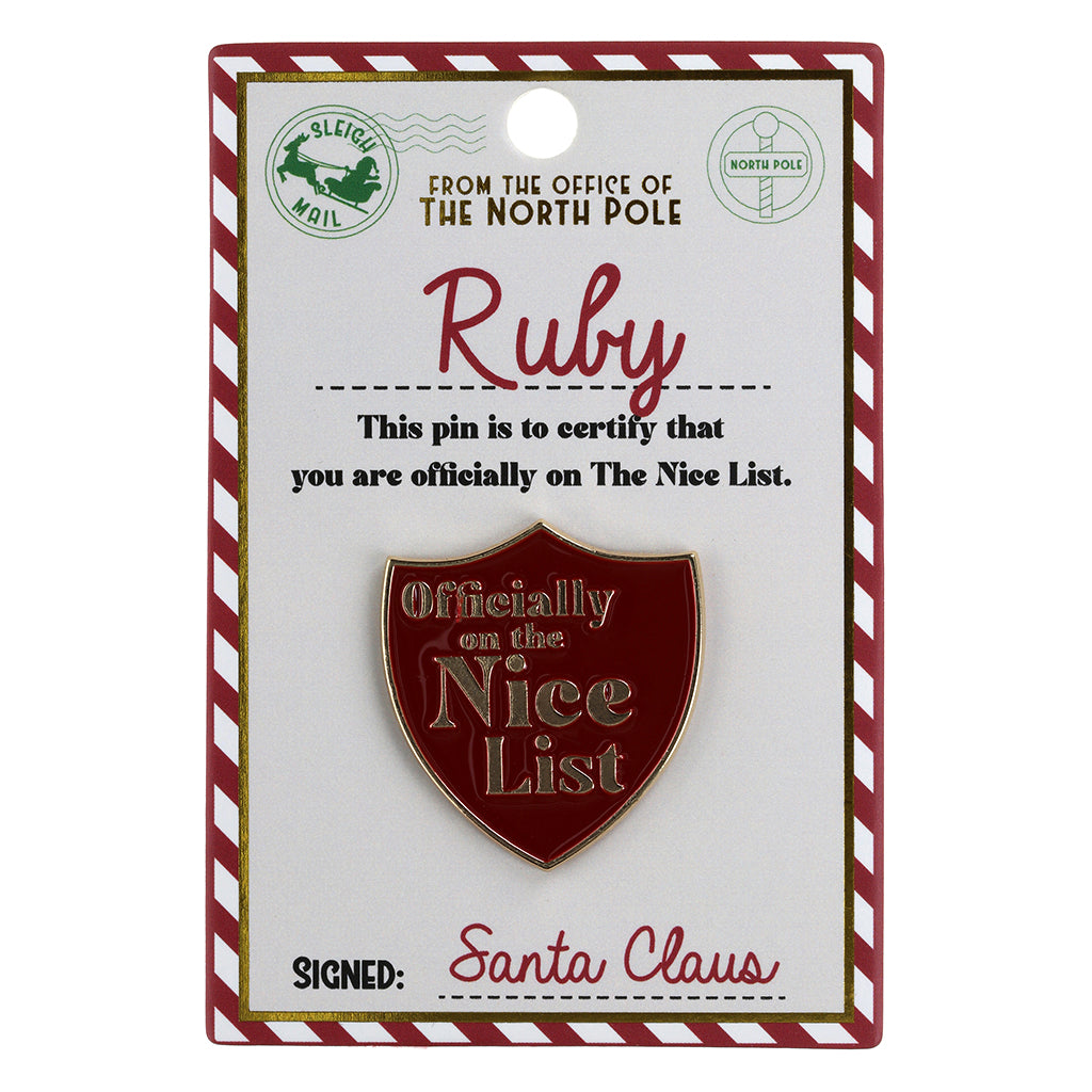 This red "Officially on the Nice List" badge is presented on a personalised card addressed to 'Ruby' and signed from Santa Claus, ensuring a unique touch for the recipient. Whether for family, friends, or colleagues, this little token of festive cheer is sure to bring a smile on anyone's face.