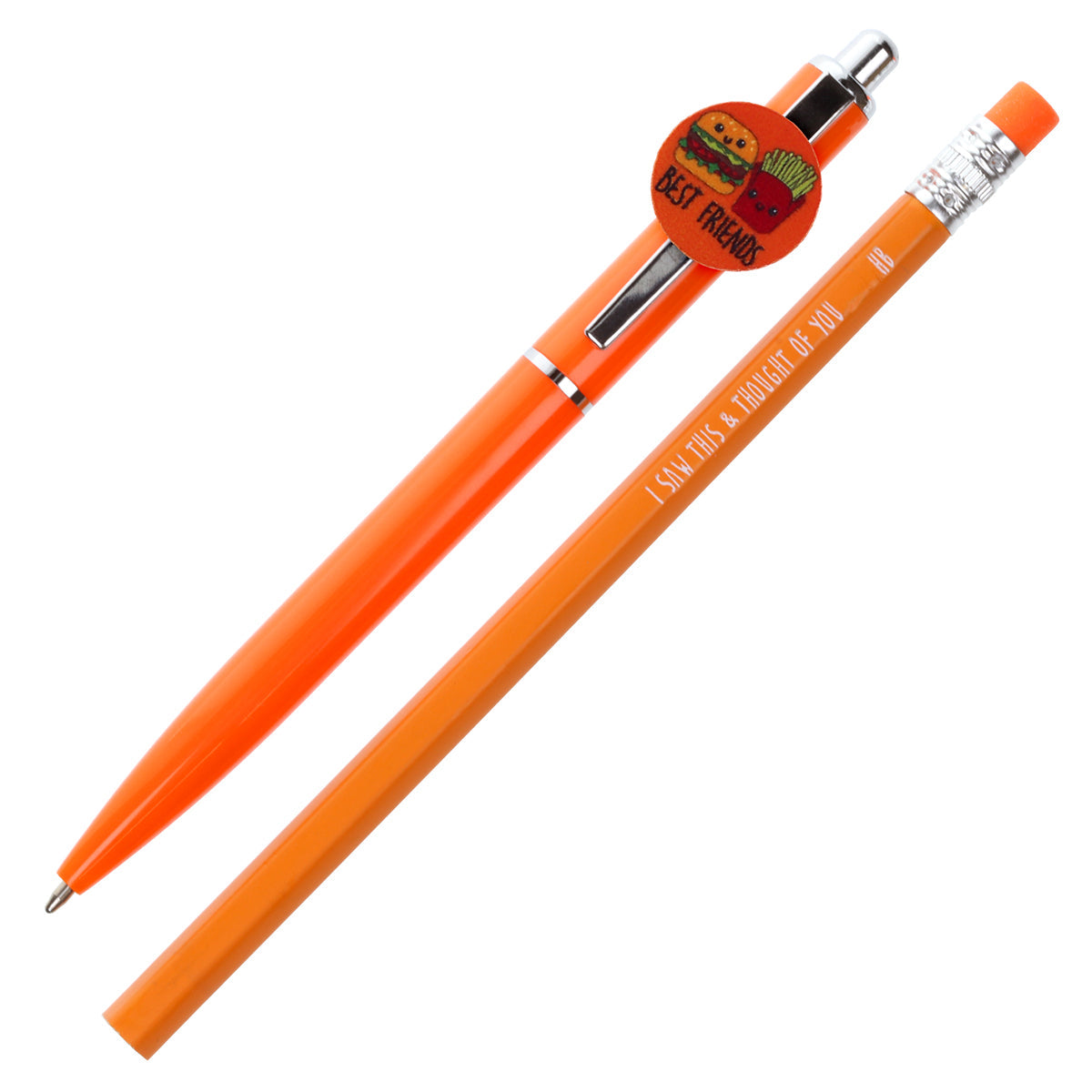 Fill your pencil case with style! This novelty orange 'Best Friends' burger and fries pen and pencil set brings a pop of fun to your stationery collection. Perfect for unleashing creativity, this kit is a must-have for stylish and functional writing essentials.