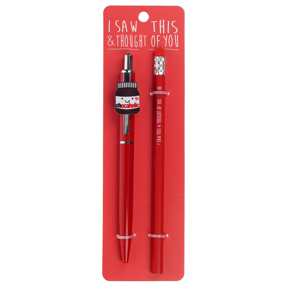 Fill your pencil case with style! This novelty red 'Chocaholic' pen and pencil set brings a pop of fun to your stationery collection. Perfect for unleashing creativity, this kit is a must-have for stylish and functional writing essentials.