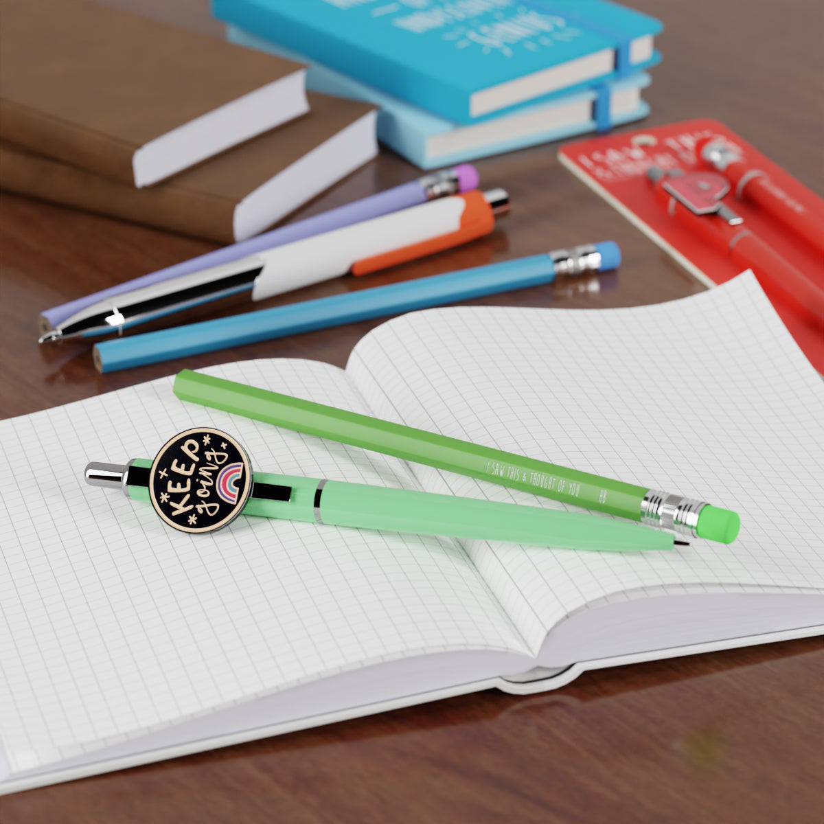 Fill your pencil case with style! This novelty green 'Keep Going' pen and pencil set brings a pop of fun to your stationery collection. Perfect for unleashing creativity, this kit is a must-have for stylish and functional writing essentials.
