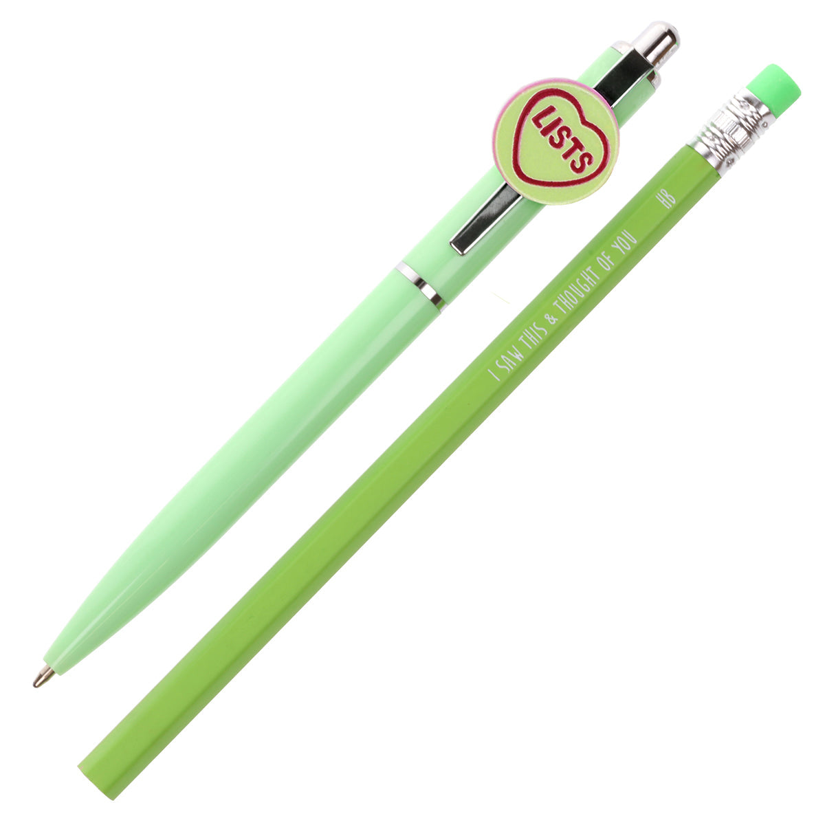 Fill your pencil case with style! This novelty green 'Love Heart Lists' pen and pencil set brings a pop of fun to your stationery collection. Perfect for unleashing creativity, this kit is a must-have for stylish and functional writing essentials.