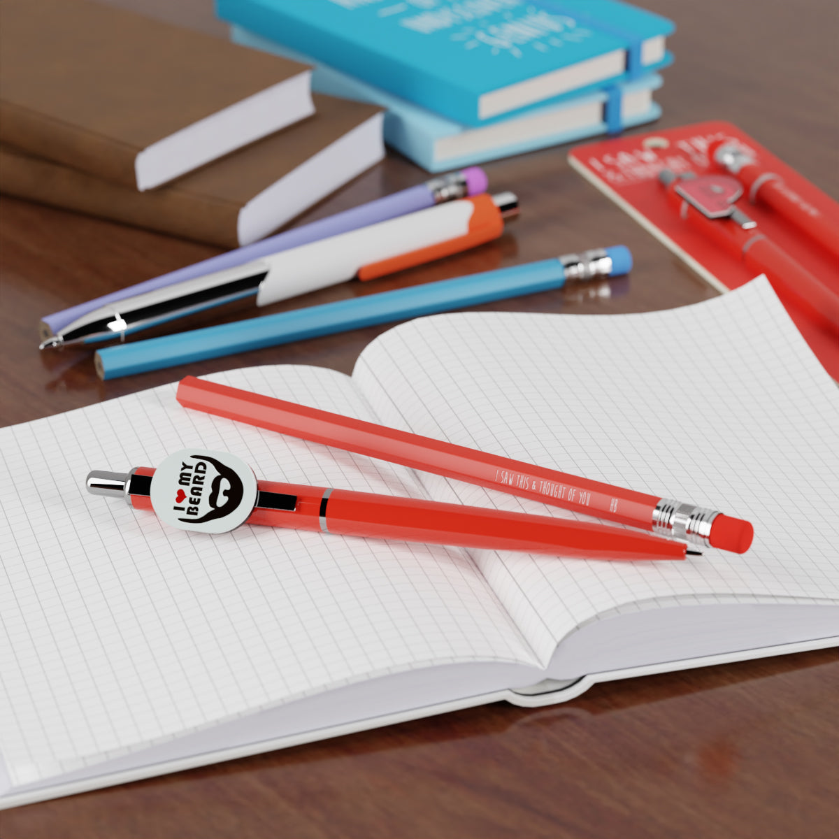 Fill your pencil case with style! This novelty red 'I Love My Beard' pen and pencil set brings a pop of fun to your stationery collection. Perfect for unleashing creativity, this kit is a must-have for stylish and functional writing essentials.