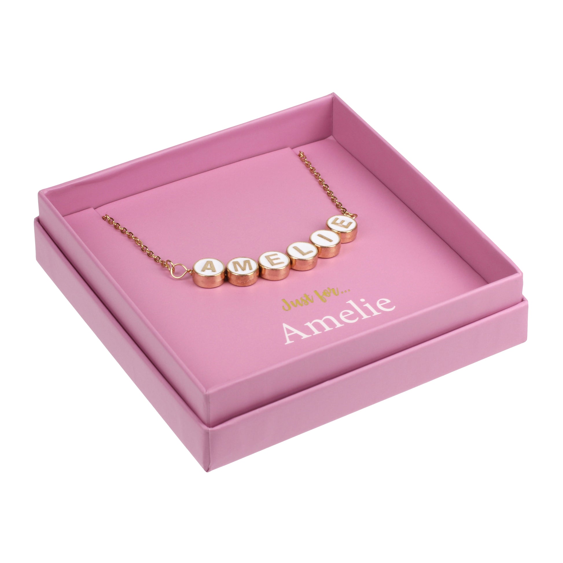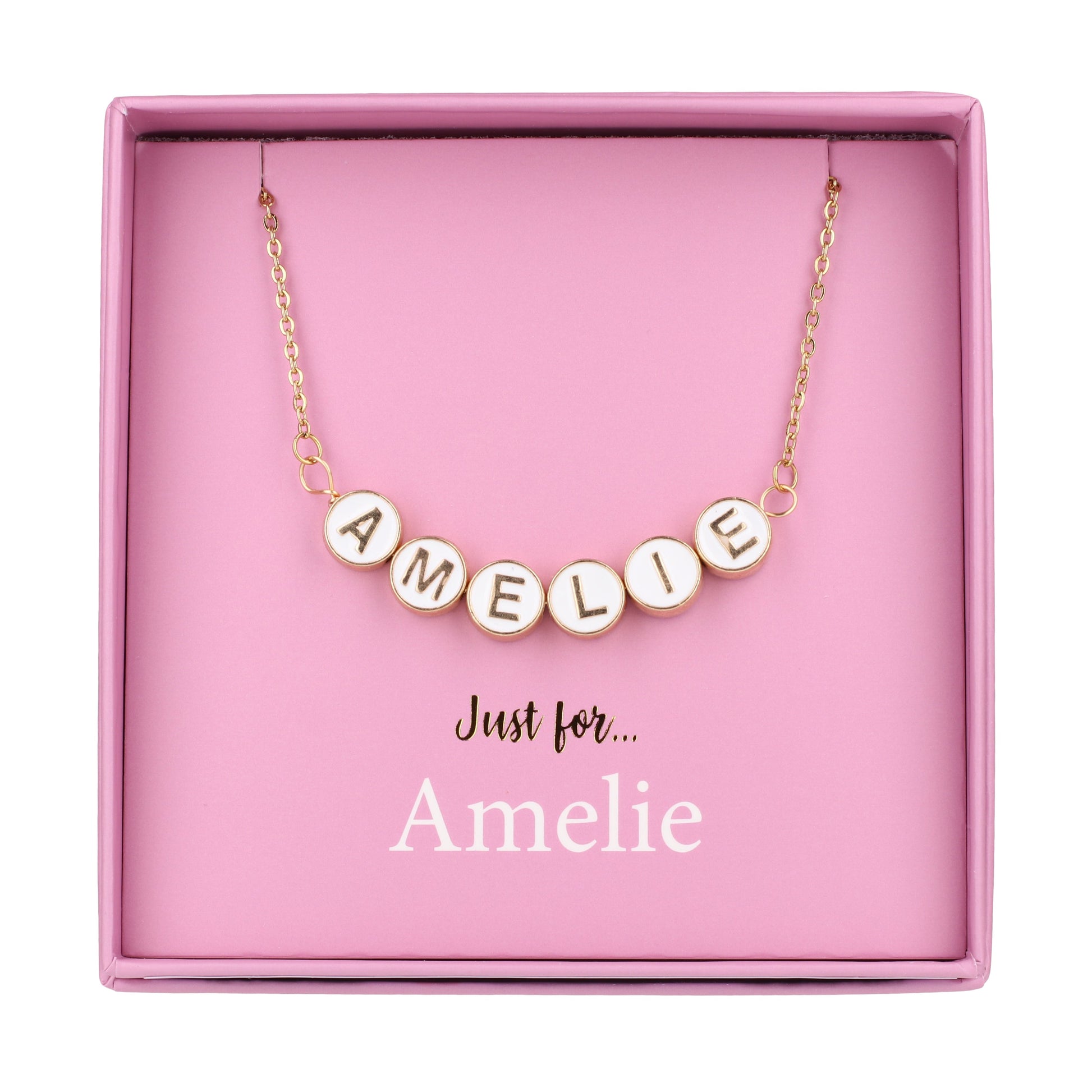 Introducing our personalised name necklace, a stunning accessory designed to bring elegance and individuality to any look. This necklace features the name 'Amelie', beautifully crafted with round gold-tone beads that showcase a delicate white centre and striking gold-tone letters.