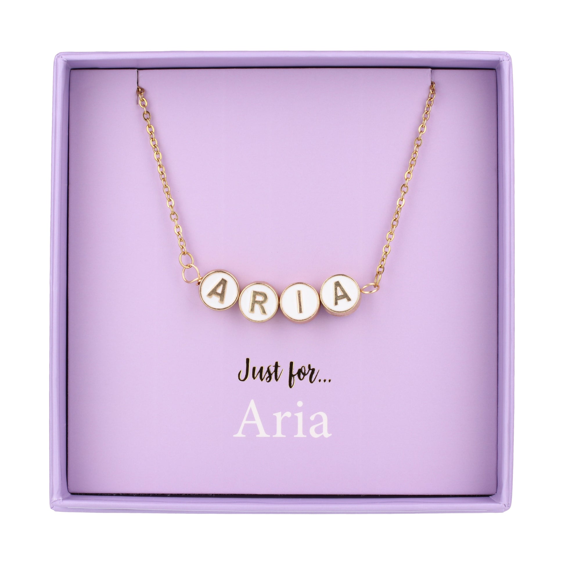 Introducing our personalised name necklace, a stunning accessory designed to bring elegance and individuality to any look. This necklace features the name 'Aria', beautifully crafted with round gold-tone beads that showcase a delicate white centre and striking gold-tone letters.