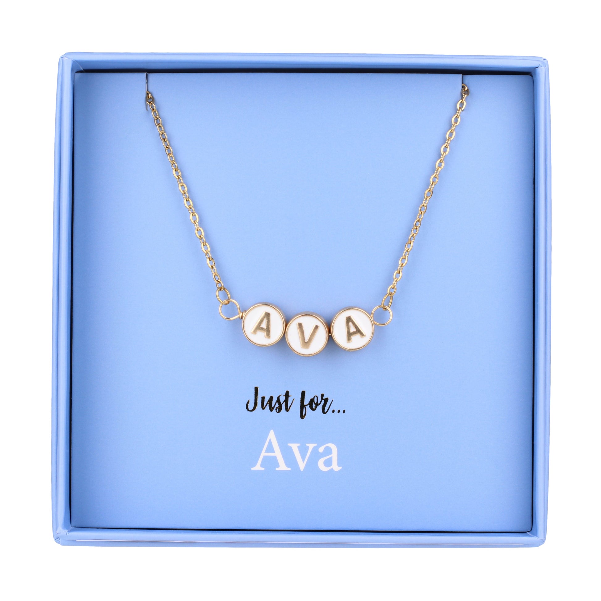Introducing our personalised name necklace, a stunning accessory designed to bring elegance and individuality to any look. This necklace features the name 'Ava', beautifully crafted with round gold-tone beads that showcase a delicate white centre and striking gold-tone letters.