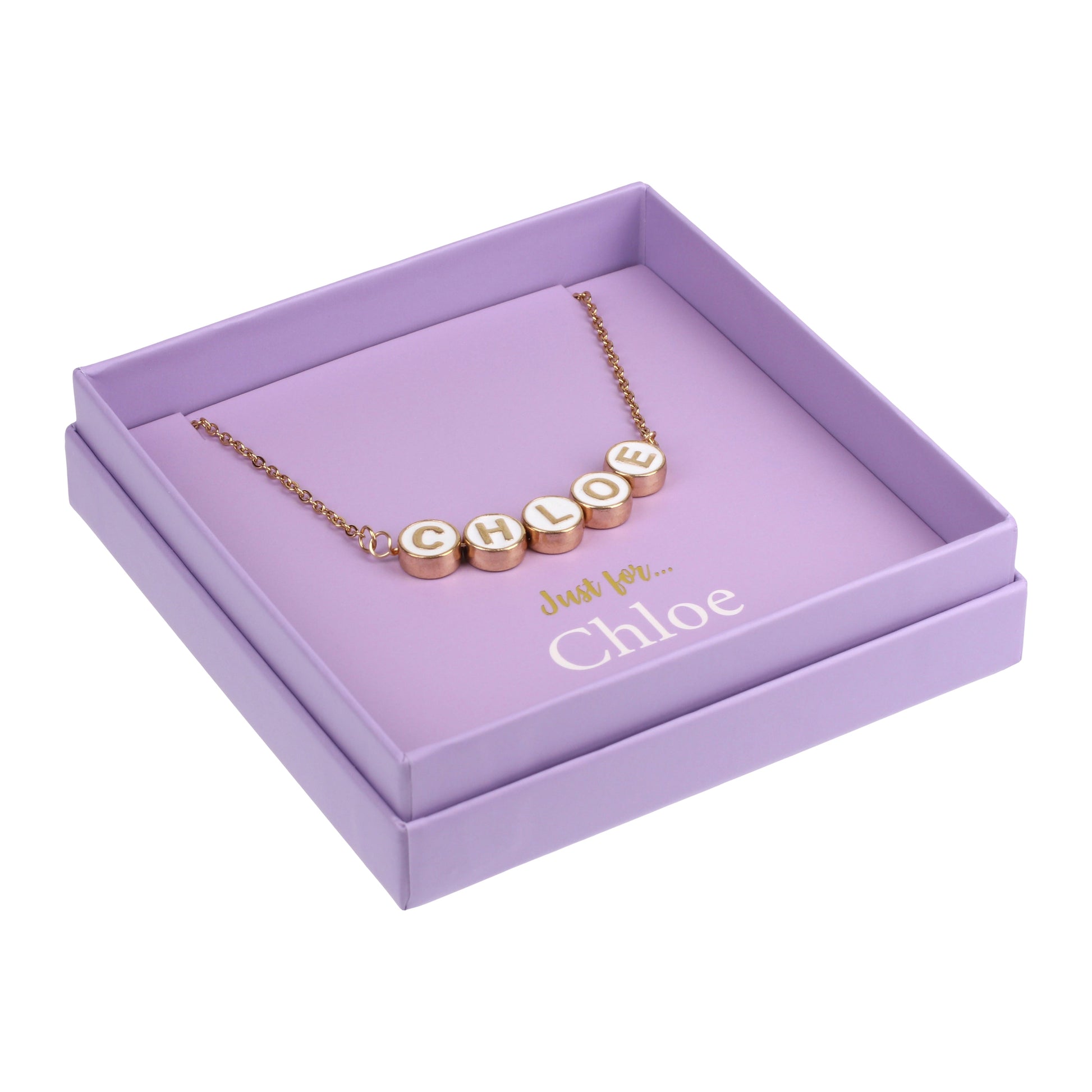Introducing our personalised name necklace, a stunning accessory designed to bring elegance and individuality to any look. This necklace features the name 'Chloe', beautifully crafted with round gold-tone beads that showcase a delicate white centre and striking gold-tone letters.