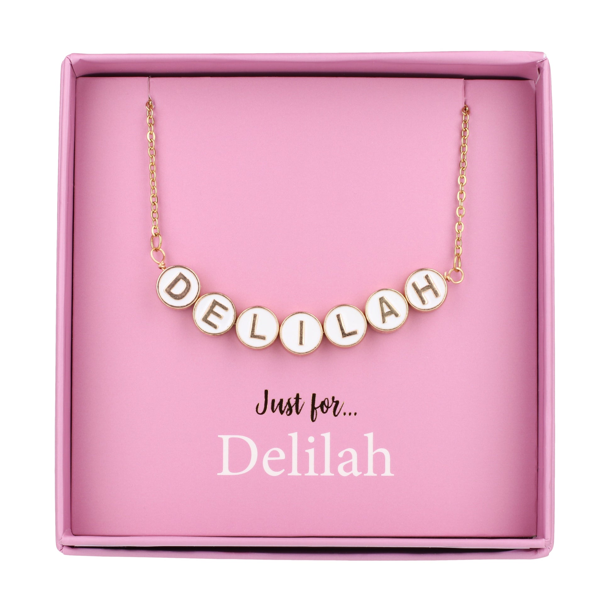 Introducing our personalised name necklace, a stunning accessory designed to bring elegance and individuality to any look. This necklace features the name 'Darcie', beautifully crafted with round gold-tone beads that showcase a delicate white centre and striking gold-tone letters.