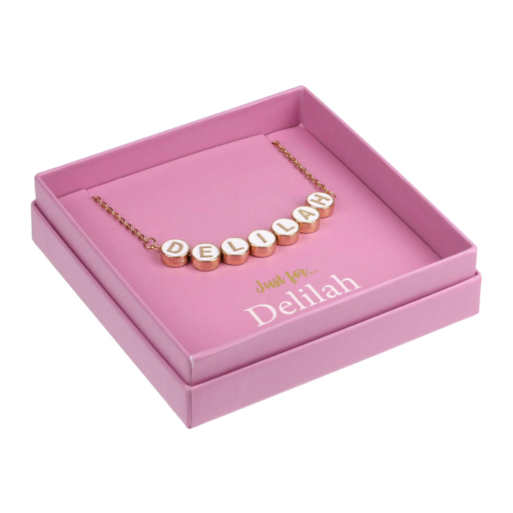 Introducing our personalised name necklace, a stunning accessory designed to bring elegance and individuality to any look. This necklace features the name 'Delilah', beautifully crafted with round gold-tone beads that showcase a delicate white centre and striking gold-tone letters.