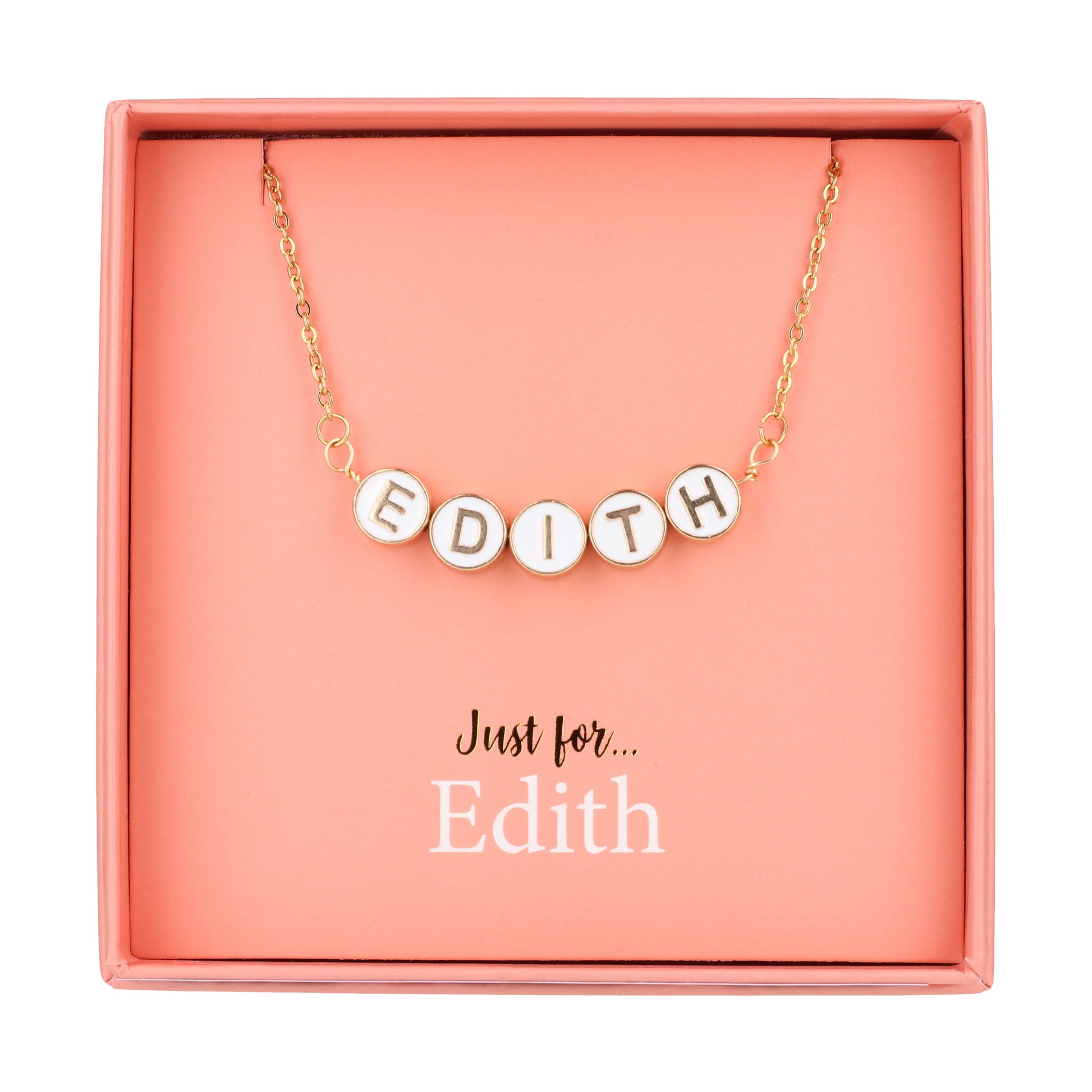 Introducing our personalised name necklace, a stunning accessory designed to bring elegance and individuality to any look. This necklace features the initial 'E', beautifully crafted with round gold-tone beads that showcase a delicate white centre and striking gold-tone letters.