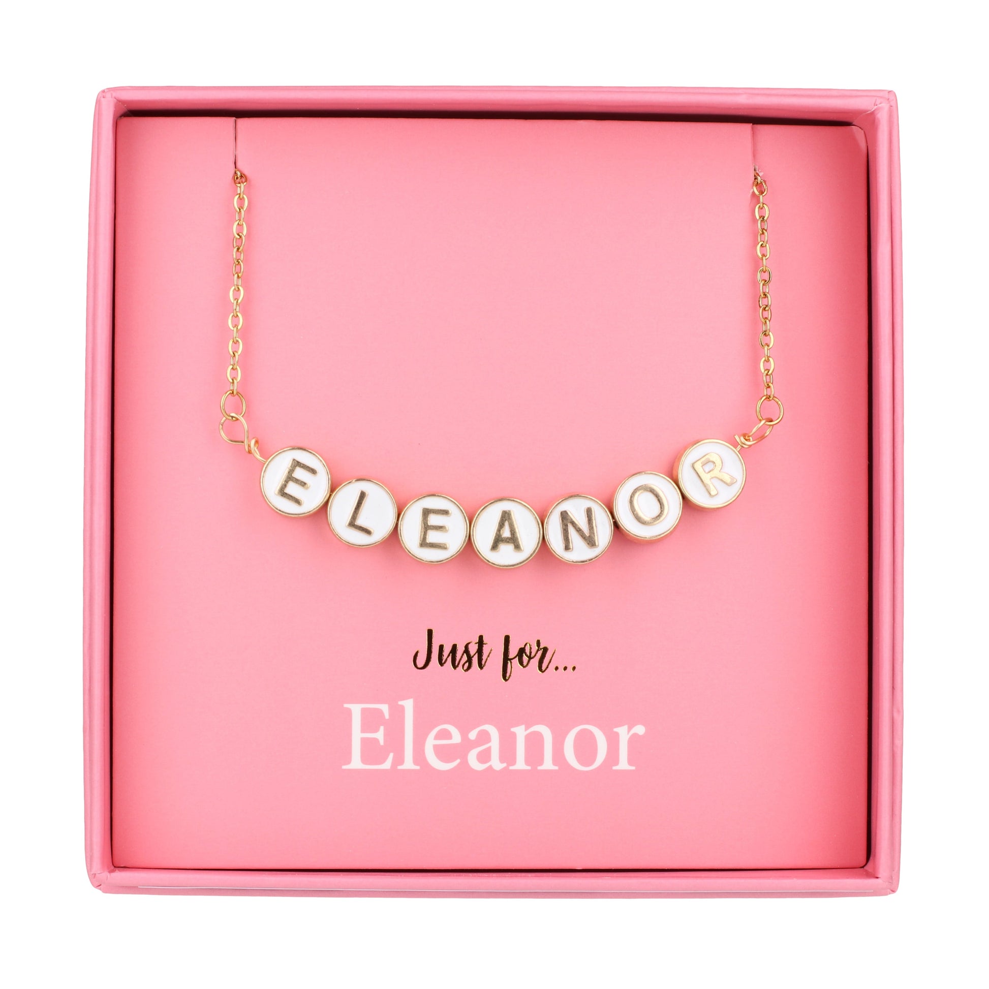 Introducing our personalised name necklace, a stunning accessory designed to bring elegance and individuality to any look. This necklace features the name 'Eleanor', beautifully crafted with round gold-tone beads that showcase a delicate white centre and striking gold-tone letters.