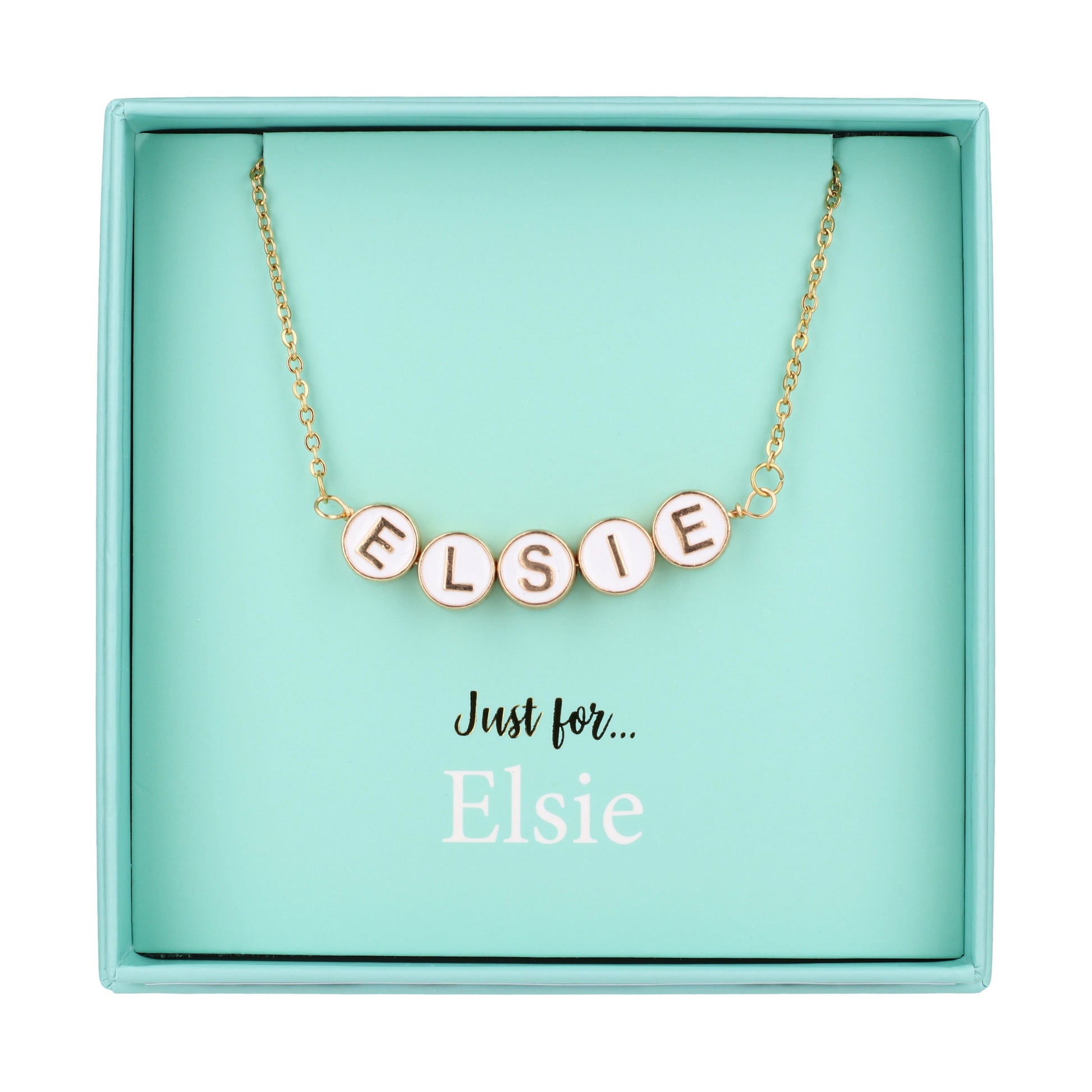 Introducing our personalised name necklace, a stunning accessory designed to bring elegance and individuality to any look. This necklace features the name 'Elsie', beautifully crafted with round gold-tone beads that showcase a delicate white centre and striking gold-tone letters.