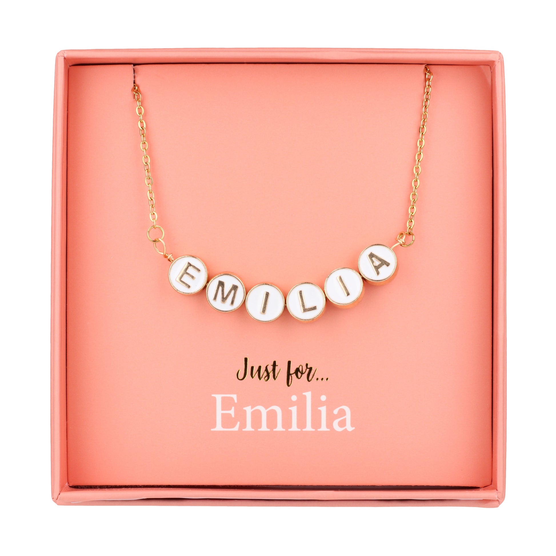 Introducing our personalised name necklace, a stunning accessory designed to bring elegance and individuality to any look. This necklace features the name 'Emilia', beautifully crafted with round gold-tone beads that showcase a delicate white centre and striking gold-tone letters.