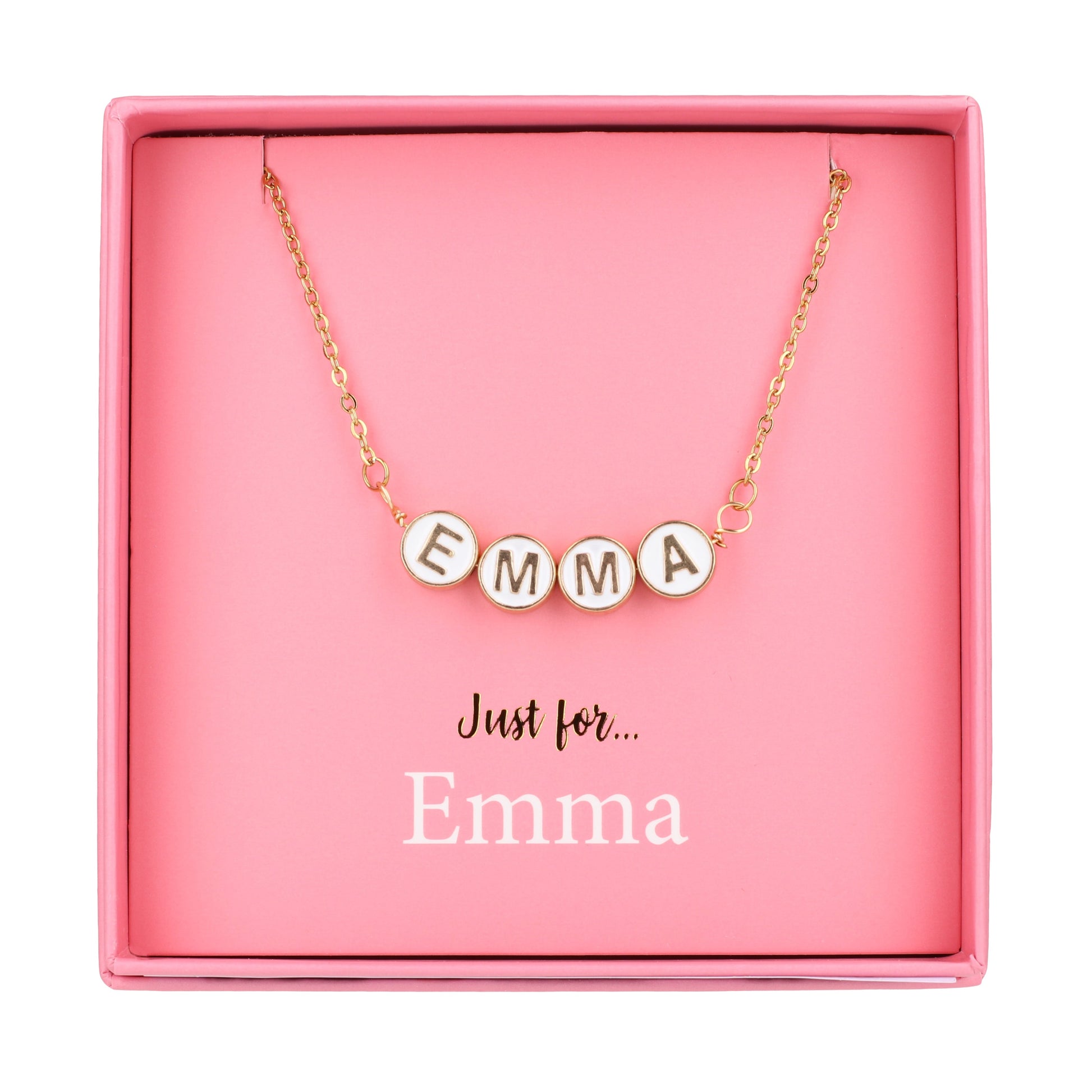 Introducing our personalised name necklace, a stunning accessory designed to bring elegance and individuality to any look. This necklace features the name 'Emma', beautifully crafted with round gold-tone beads that showcase a delicate white centre and striking gold-tone letters.