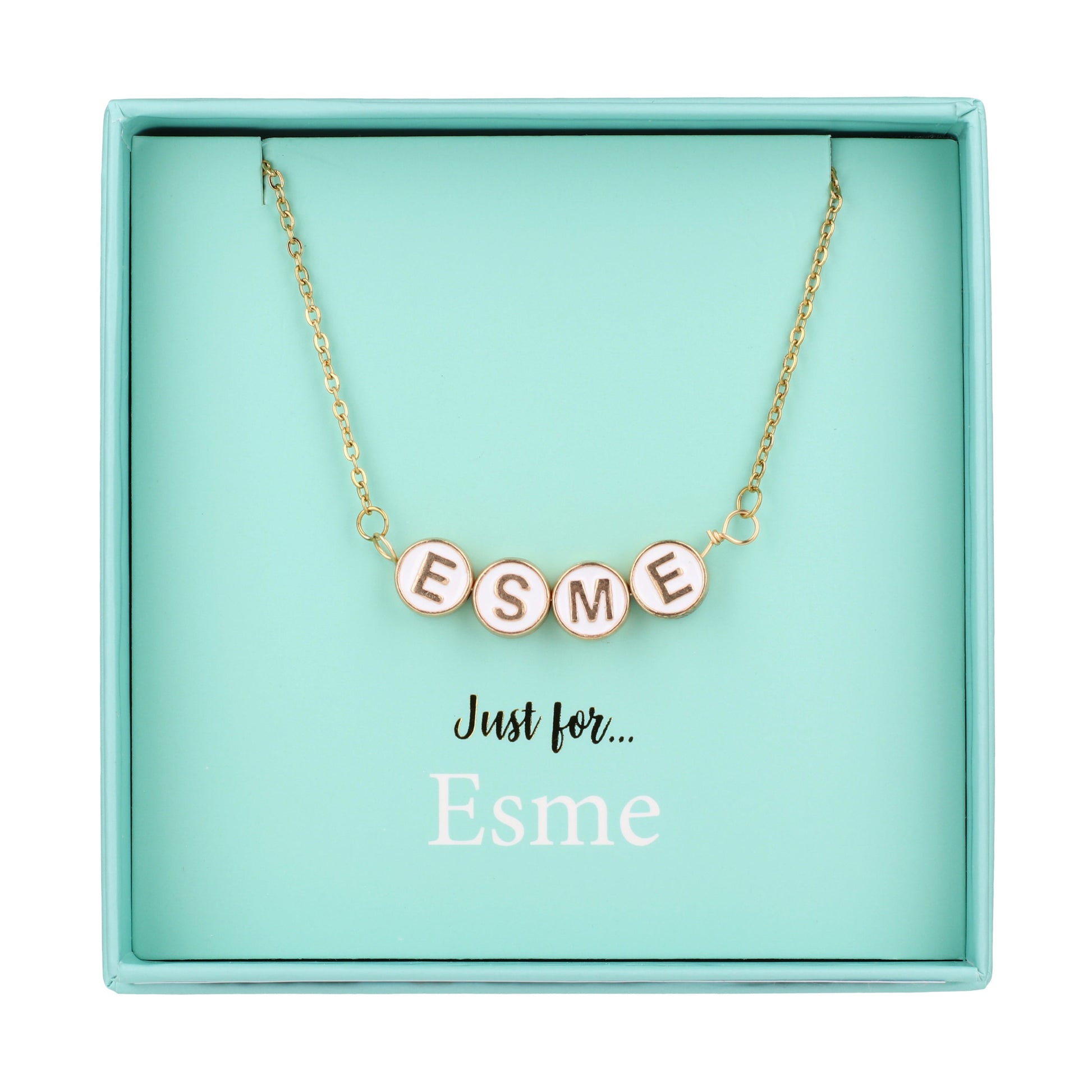 Introducing our personalised name necklace, a stunning accessory designed to bring elegance and individuality to any look. This necklace features the name 'Esme', beautifully crafted with round gold-tone beads that showcase a delicate white centre and striking gold-tone letters.