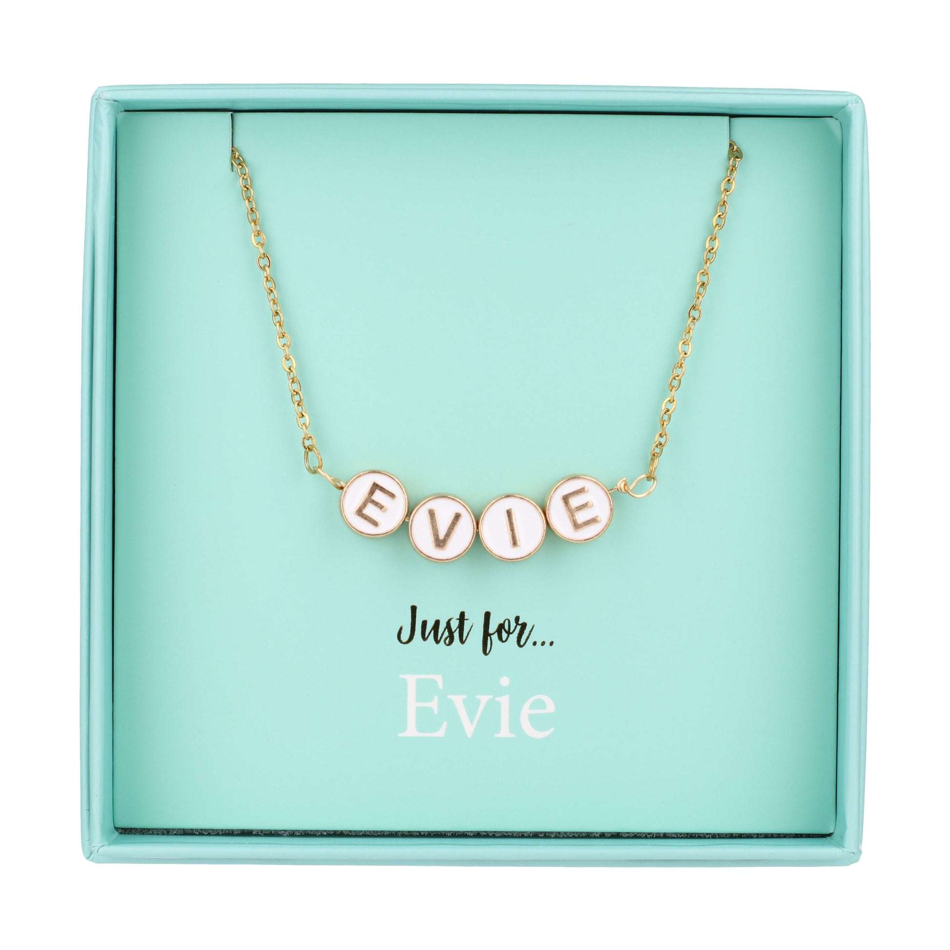 Introducing our personalised name necklace, a stunning accessory designed to bring elegance and individuality to any look. This necklace features the name 'Evie', beautifully crafted with round gold-tone beads that showcase a delicate white centre and striking gold-tone letters.