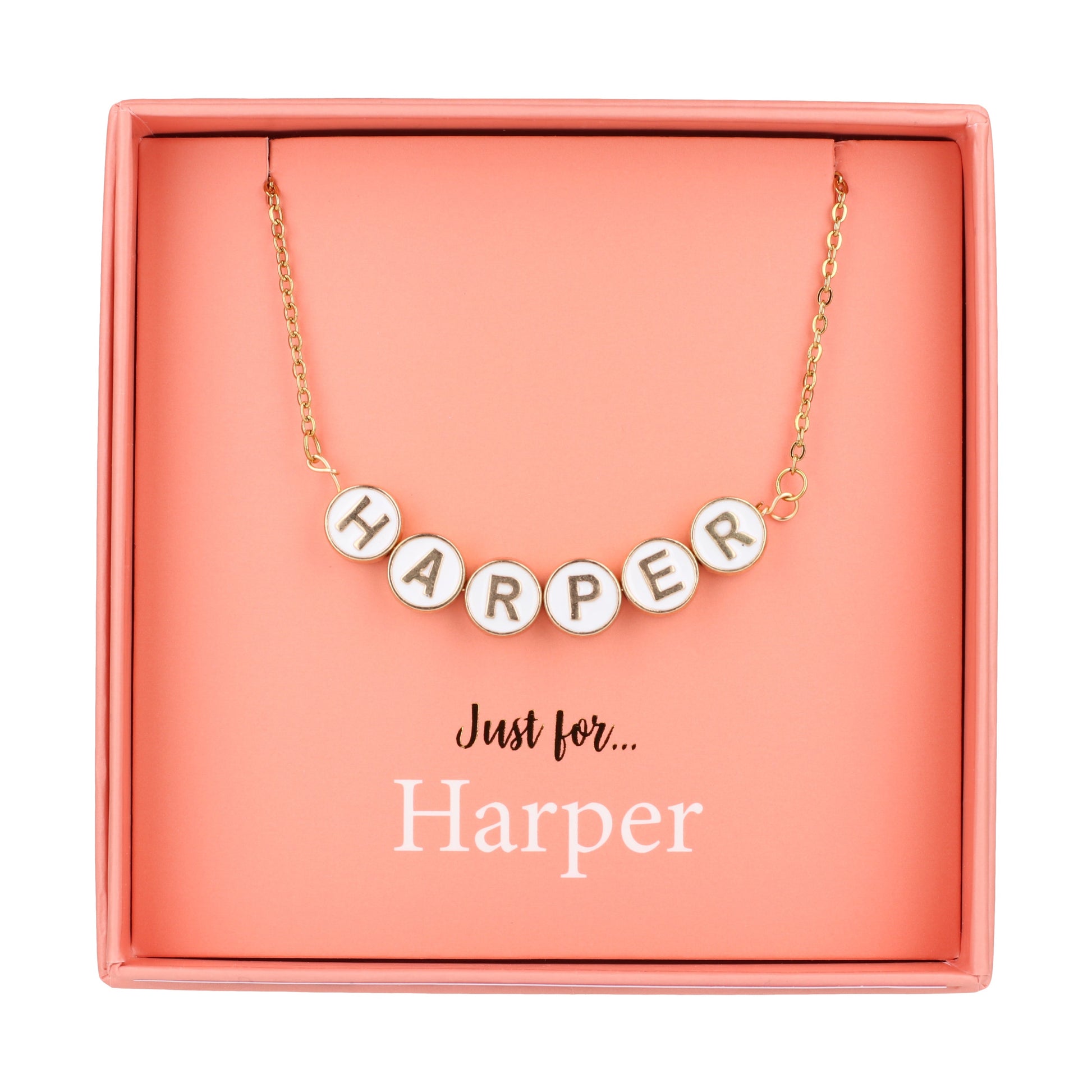 Introducing our personalised name necklace, a stunning accessory designed to bring elegance and individuality to any look. This necklace features the name 'Harper', beautifully crafted with round gold-tone beads that showcase a delicate white centre and striking gold-tone letters.