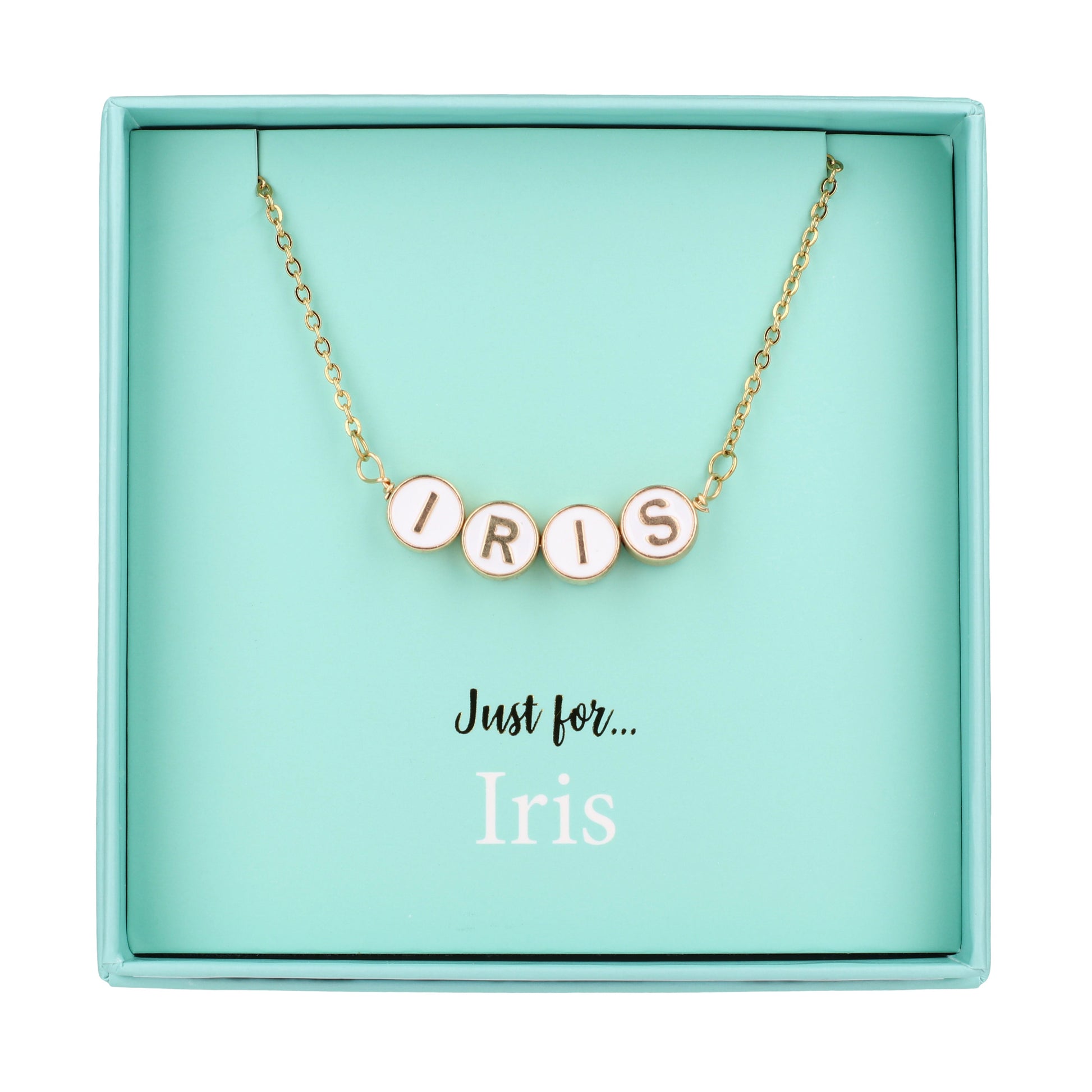 Introducing our personalised name necklace, a stunning accessory designed to bring elegance and individuality to any look. This necklace features the name 'Iris', beautifully crafted with round gold-tone beads that showcase a delicate white centre and striking gold-tone letters.