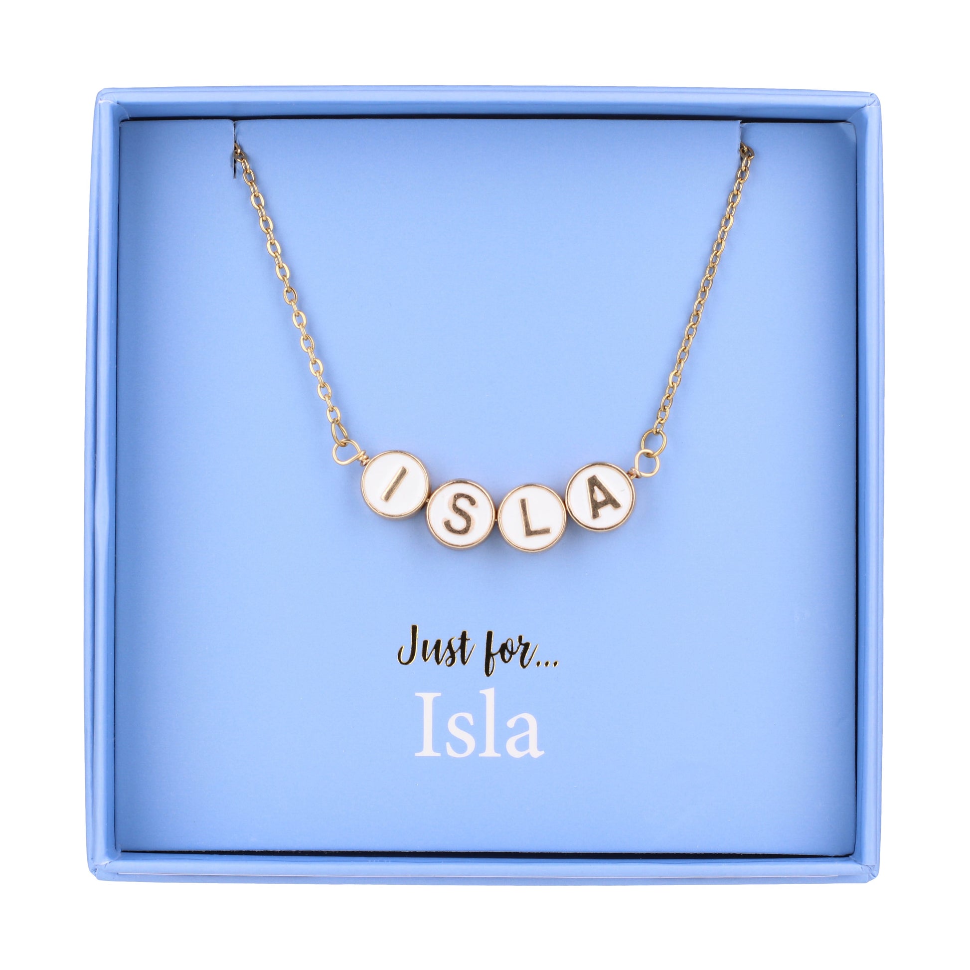 Introducing our personalised name necklace, a stunning accessory designed to bring elegance and individuality to any look. This necklace features the name 'Isla', beautifully crafted with round gold-tone beads that showcase a delicate white centre and striking gold-tone letters.