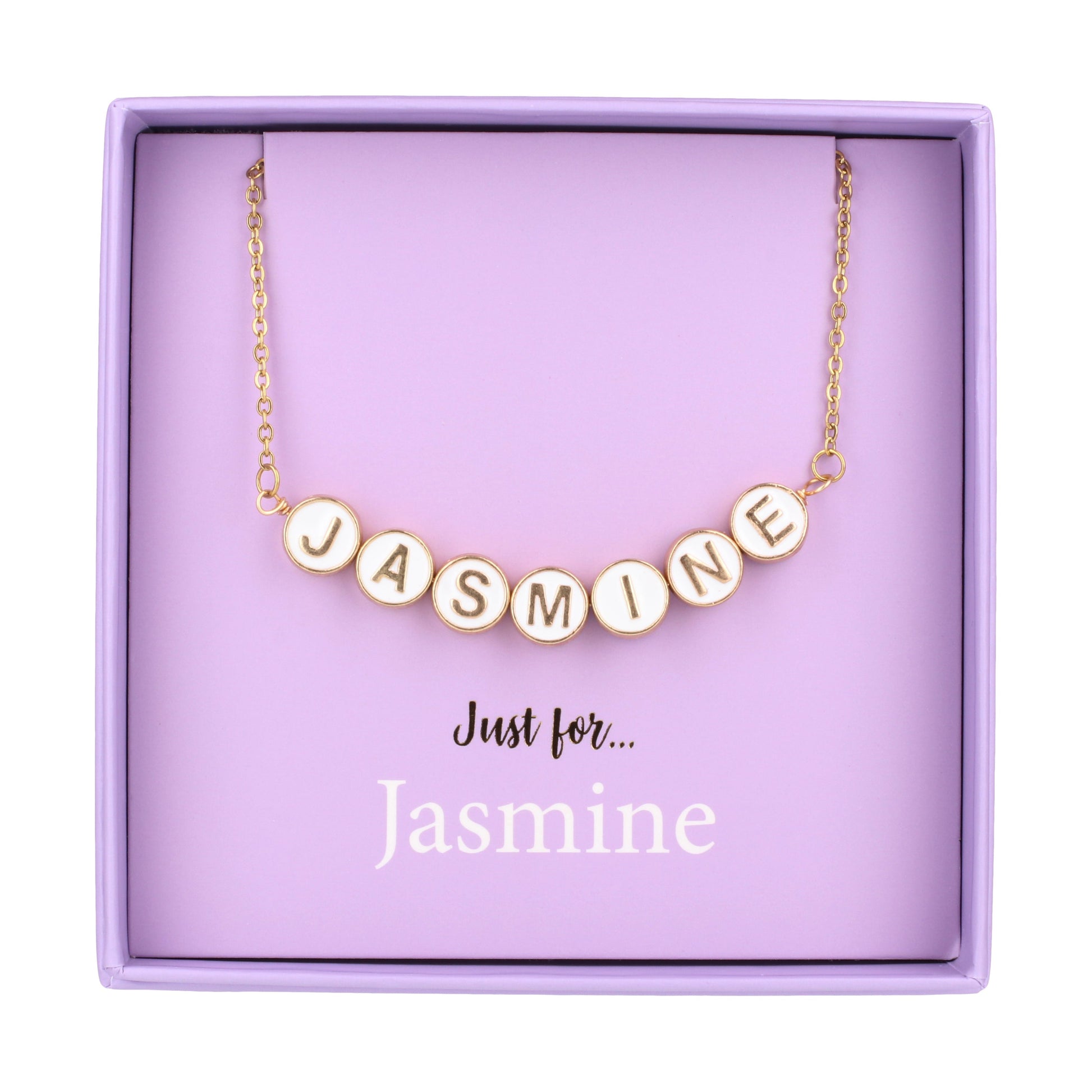 Introducing our personalised name necklace, a stunning accessory designed to bring elegance and individuality to any look. This necklace features the name 'Jasmine', beautifully crafted with round gold-tone beads that showcase a delicate white centre and striking gold-tone letters.