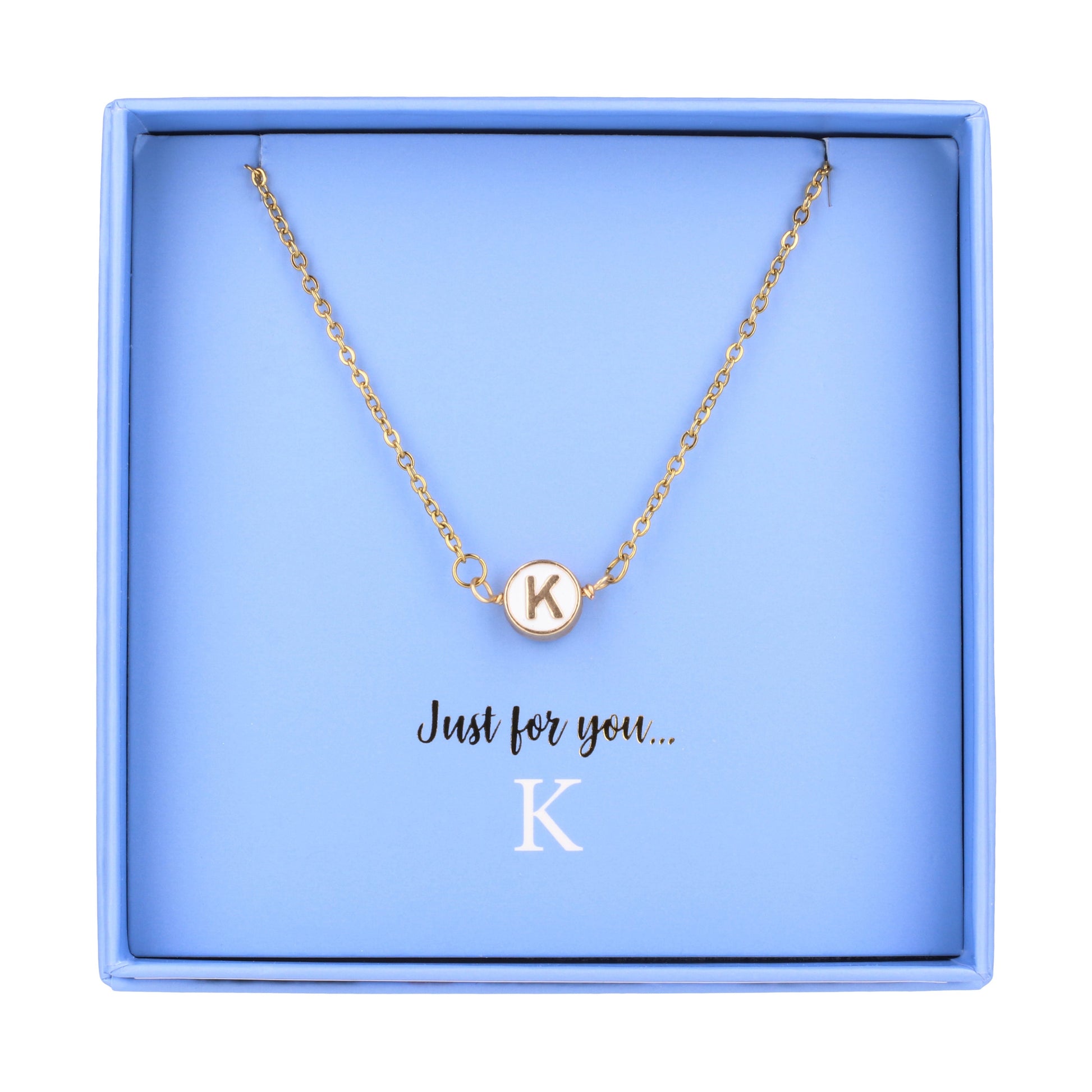 Introducing our personalised name necklace, a stunning accessory designed to bring elegance and individuality to any look. This necklace features the initial 'K', beautifully crafted with round gold-tone beads that showcase a delicate white centre and striking gold-tone letters.