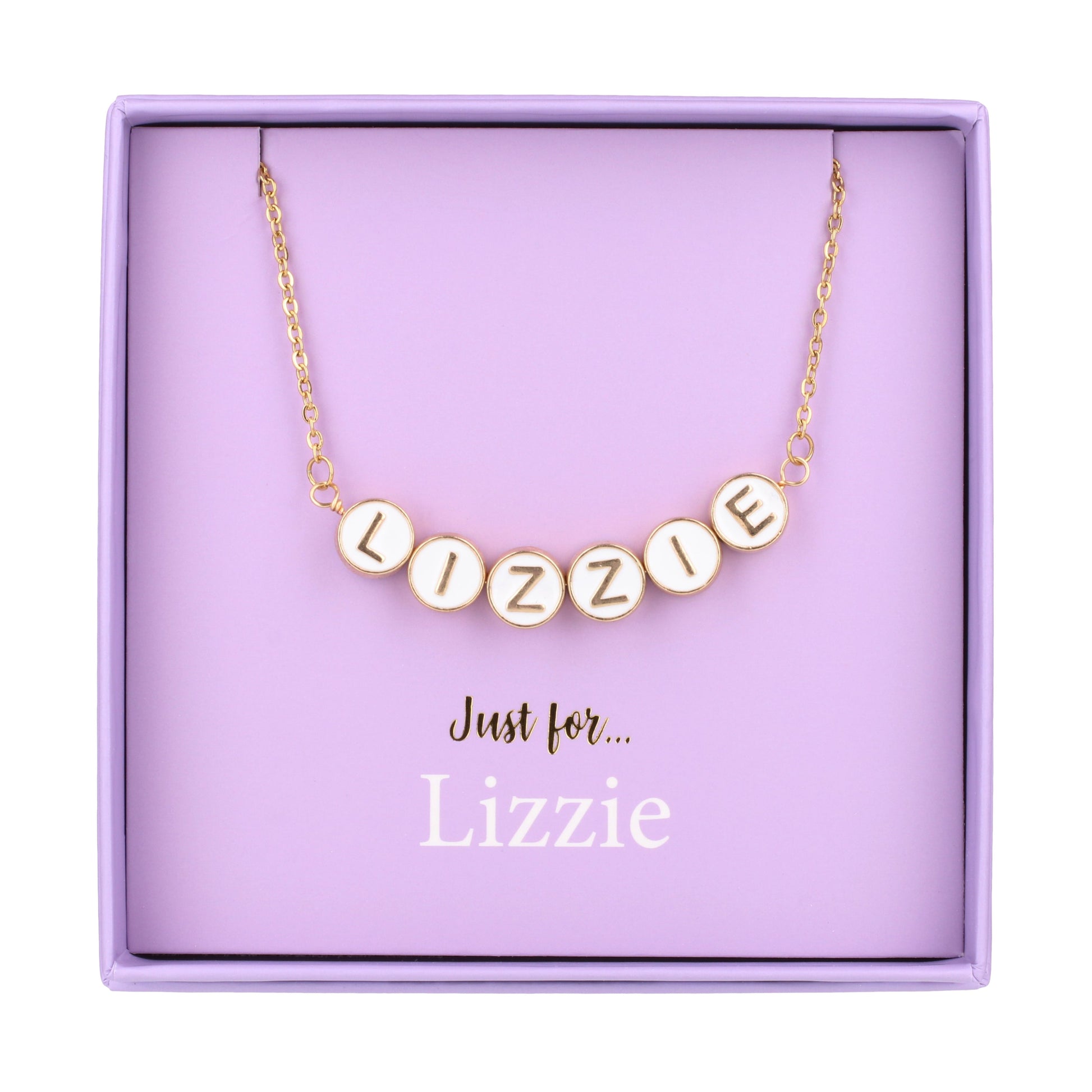 Introducing our personalised name necklace, a stunning accessory designed to bring elegance and individuality to any look. This necklace features the name 'Lizzie', beautifully crafted with round gold-tone beads that showcase a delicate white centre and striking gold-tone letters.