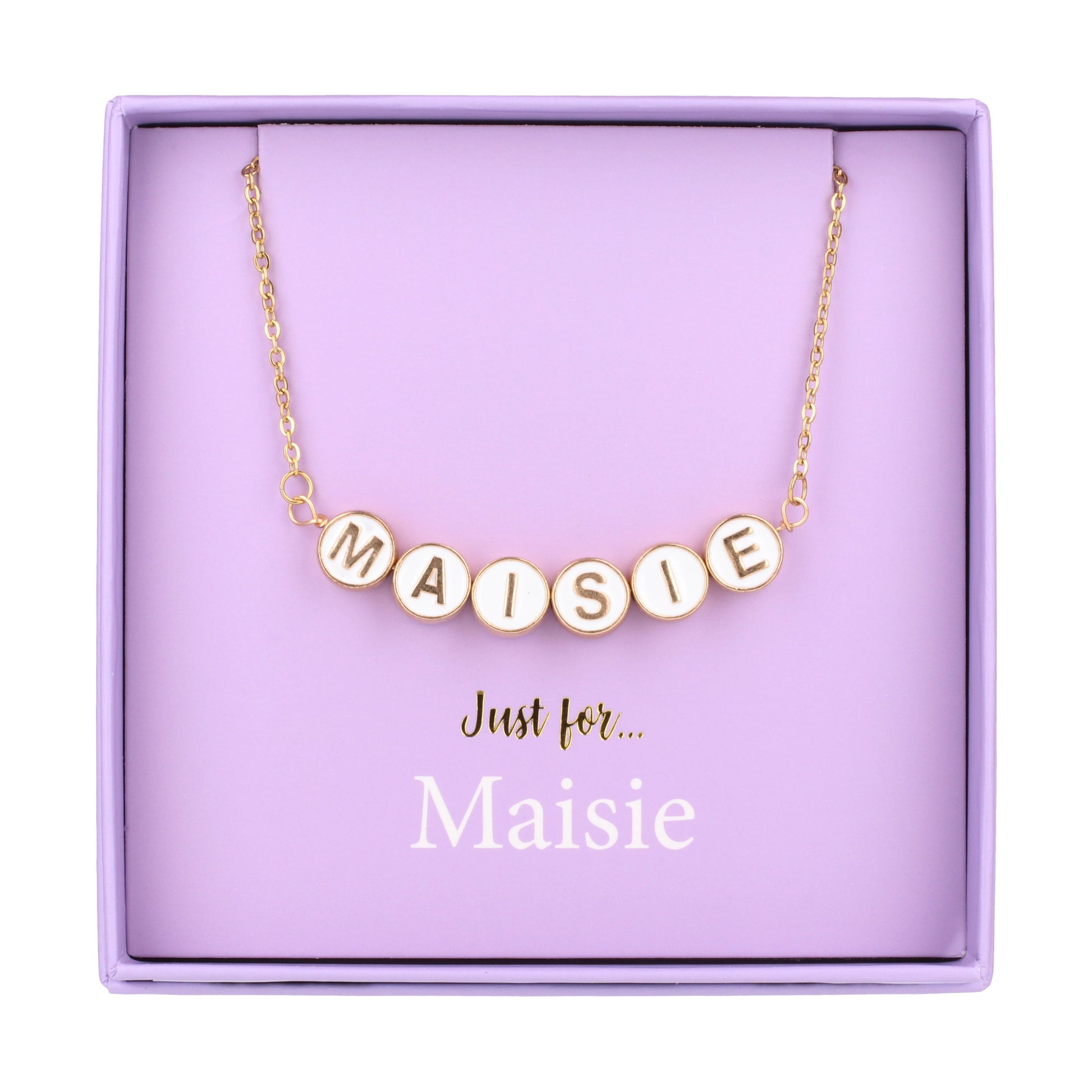 Introducing our personalised name necklace, a stunning accessory designed to bring elegance and individuality to any look. This necklace features the name 'Maisie', beautifully crafted with round gold-tone beads that showcase a delicate white centre and striking gold-tone letters.