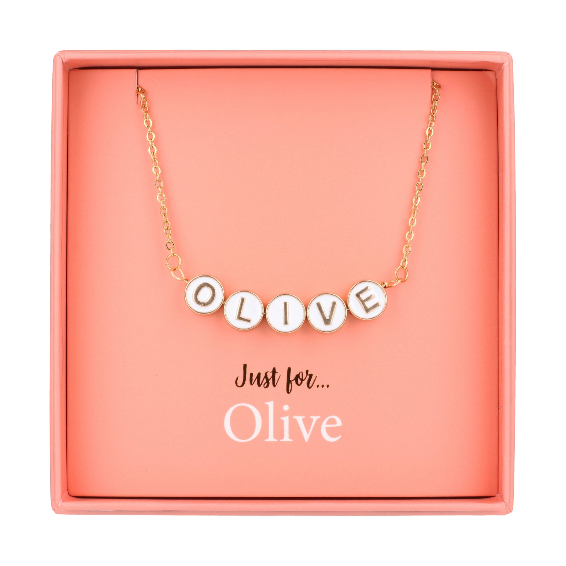Introducing our personalised name necklace, a stunning accessory designed to bring elegance and individuality to any look. This necklace features the name 'Olive', beautifully crafted with round gold-tone beads that showcase a delicate white centre and striking gold-tone letters.