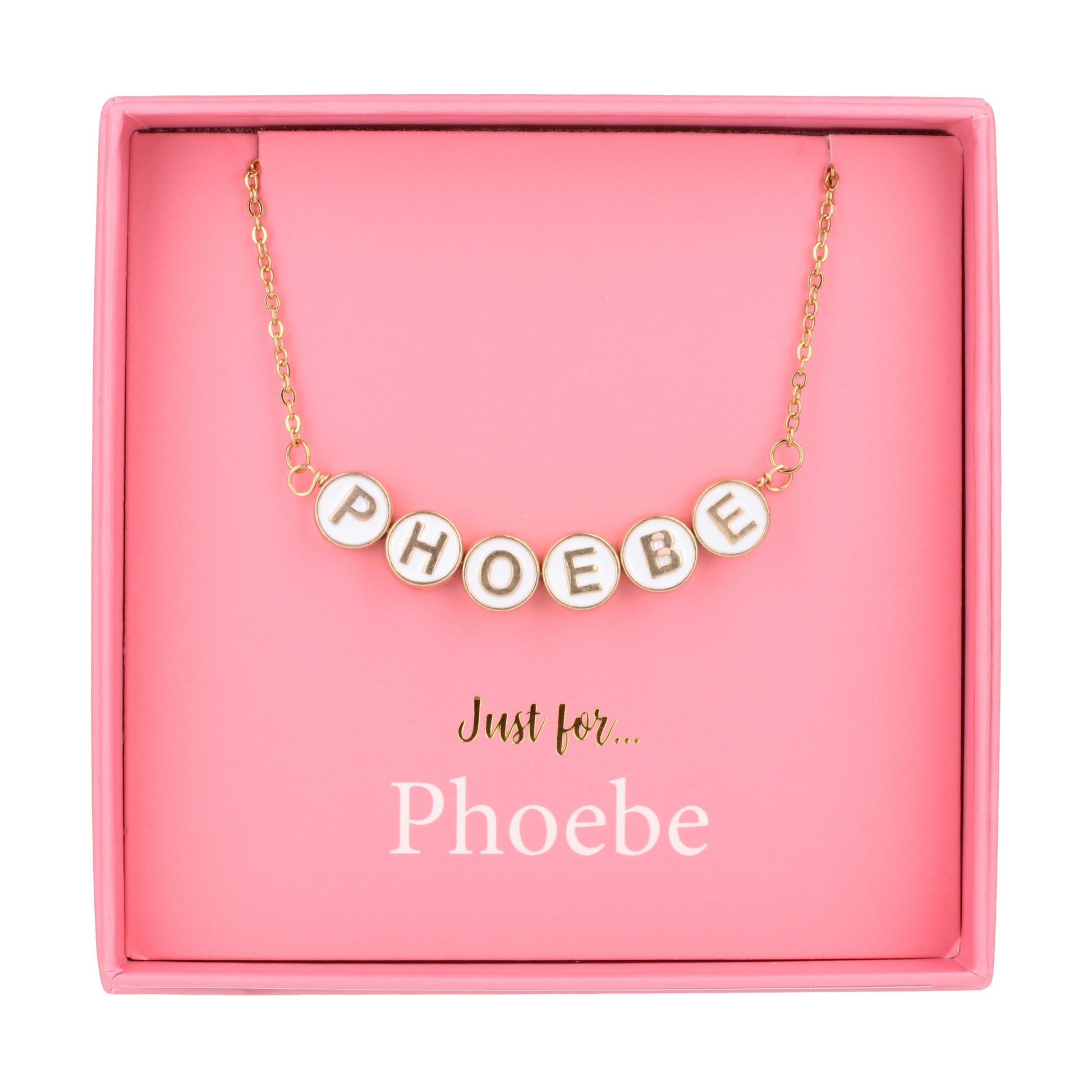 Introducing our personalised name necklace, a stunning accessory designed to bring elegance and individuality to any look. This necklace features the name 'Phoebe', beautifully crafted with round gold-tone beads that showcase a delicate white centre and striking gold-tone letters.
