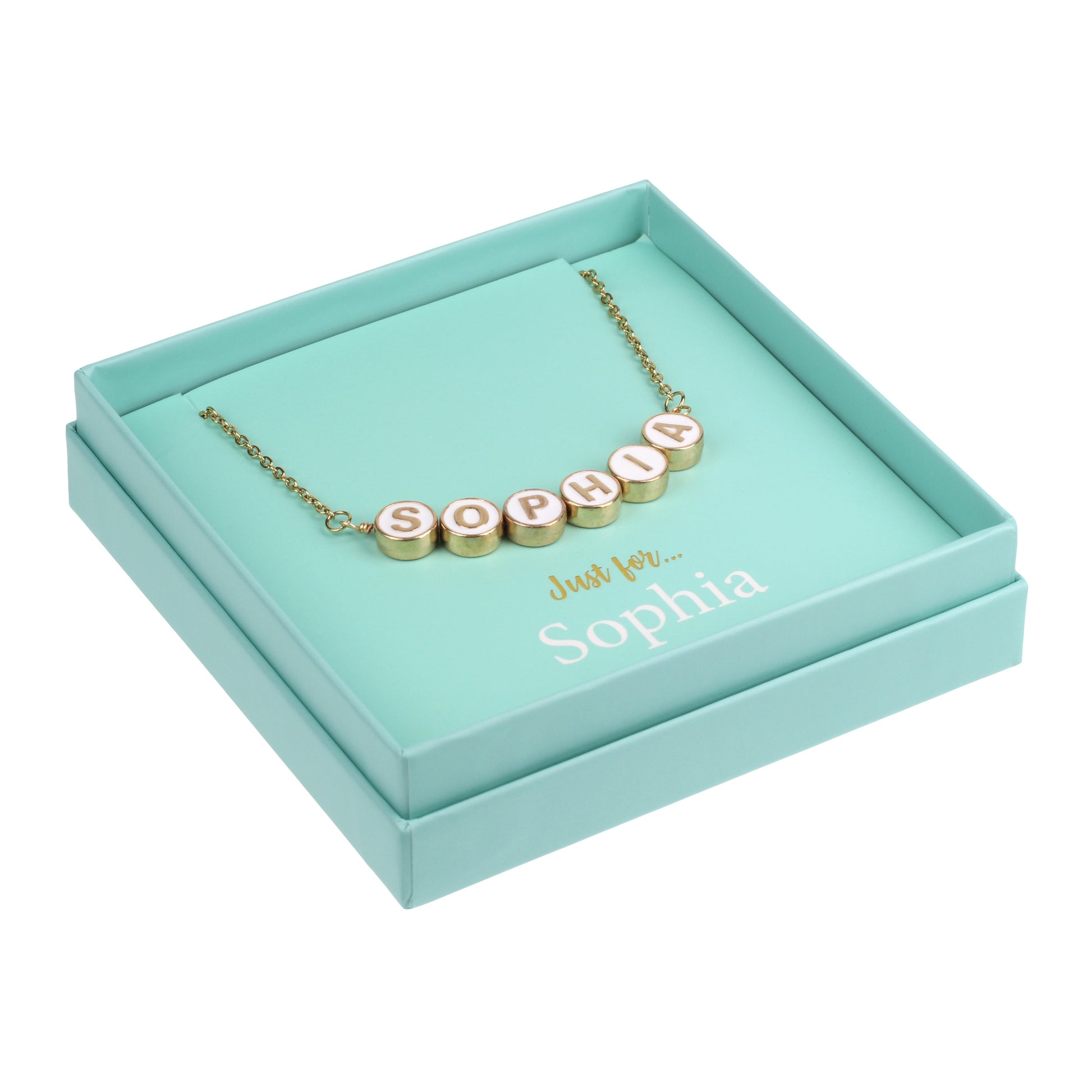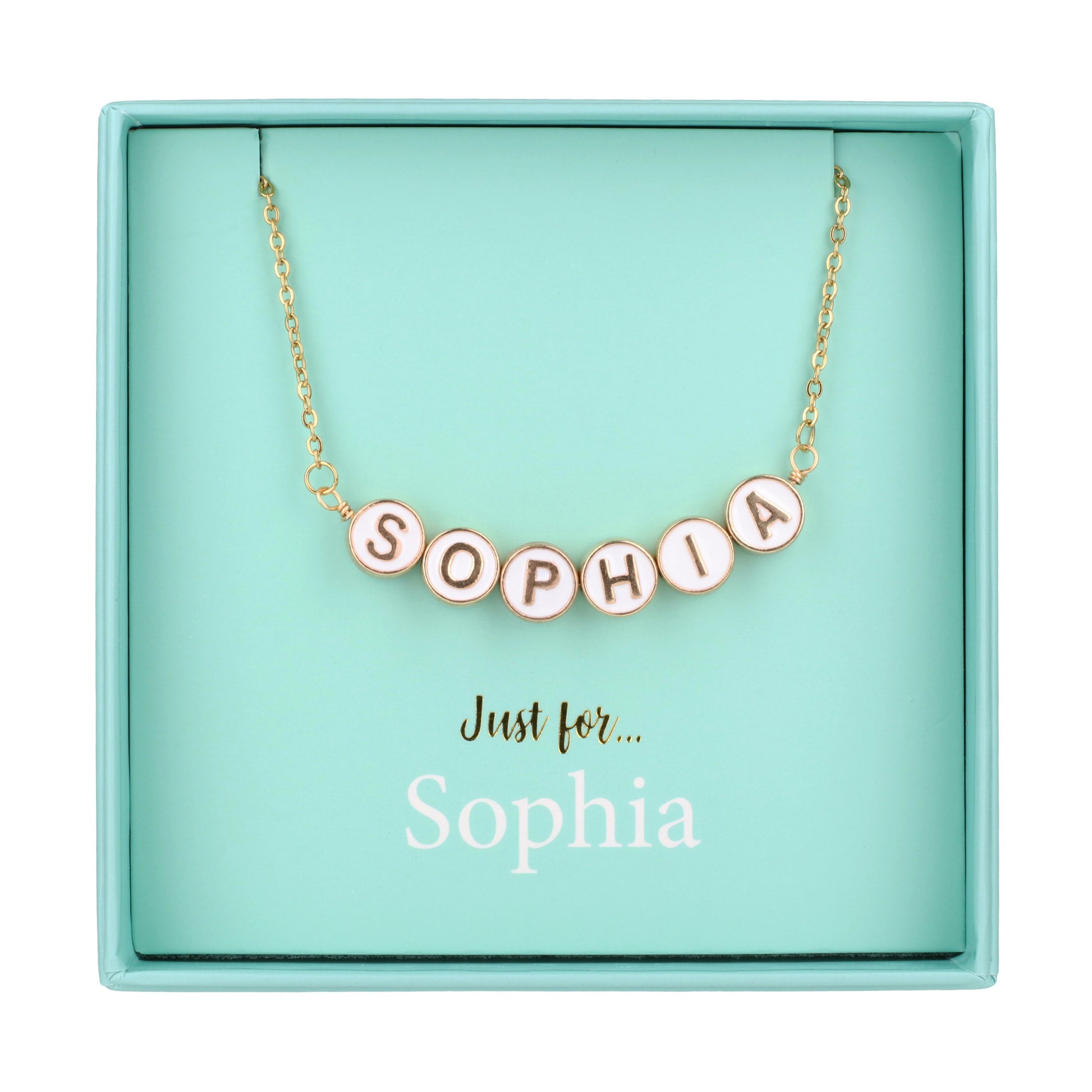 Introducing our personalised name necklace, a stunning accessory designed to bring elegance and individuality to any look. This necklace features the name 'Sophia', beautifully crafted with round gold-tone beads that showcase a delicate white centre and striking gold-tone letters.