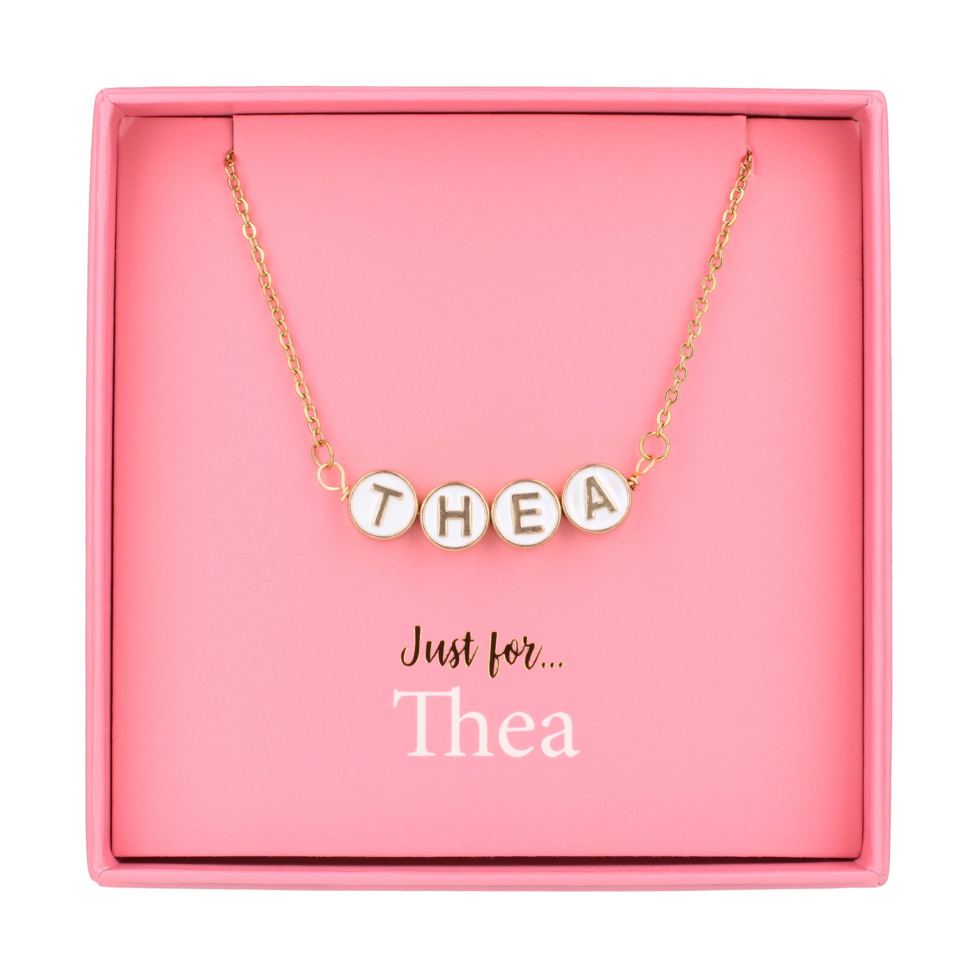 Introducing our personalised name necklace, a stunning accessory designed to bring elegance and individuality to any look. This necklace features the name 'Thea', beautifully crafted with round gold-tone beads that showcase a delicate white centre and striking gold-tone letters.