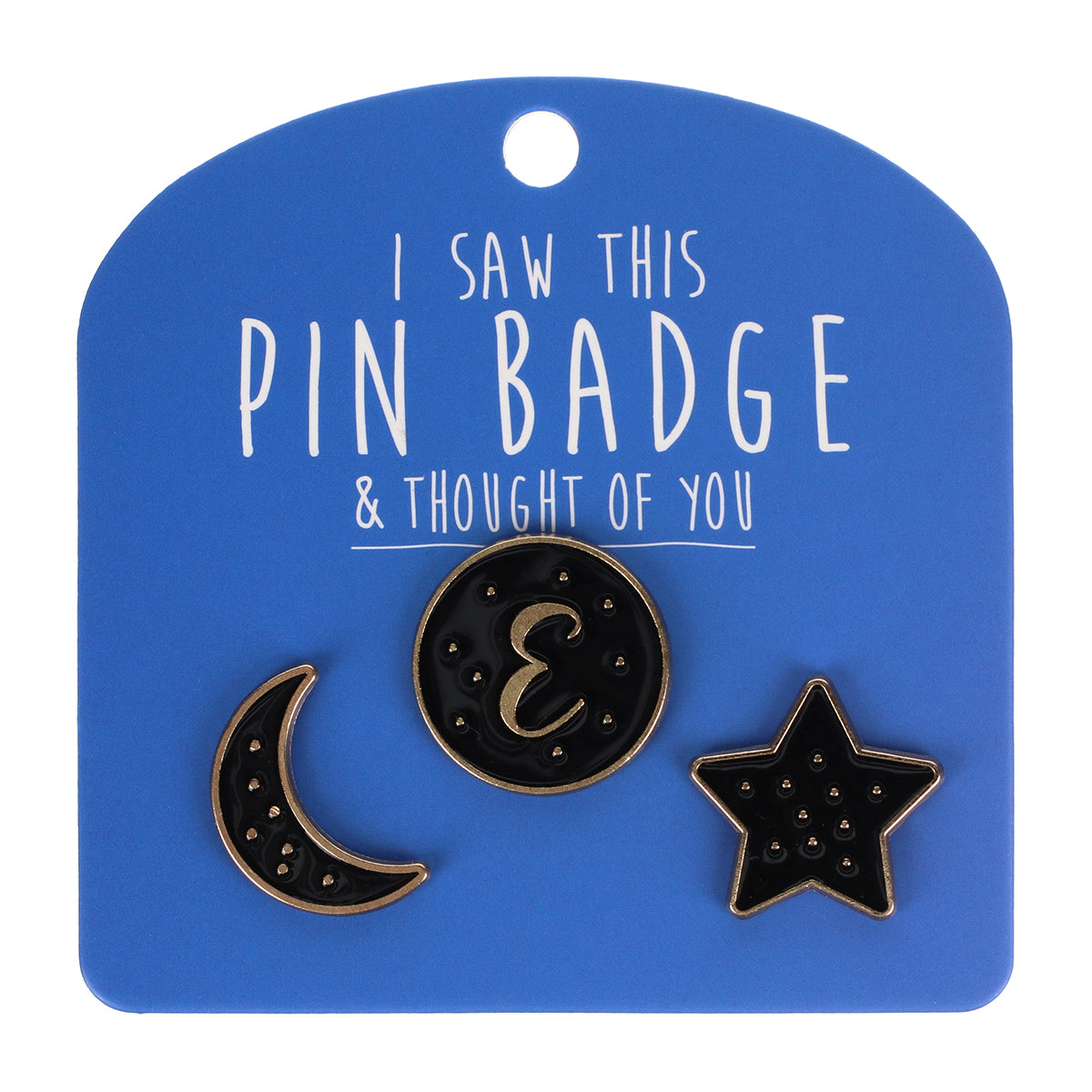 Add a touch of personality to your bags, jackets, or hats with this stylish multipack of 3 eye-catching pin badges. Featuring a 'Moon' badge, a 'Star' and an 'E Initial' badge, these packs are perfect for expressing your style or gifting to a loved one. Each badge is crafted with durable materials and a secure fastening to keep them in place. Ideal for collectors or anyone looking to customise their accessories.
