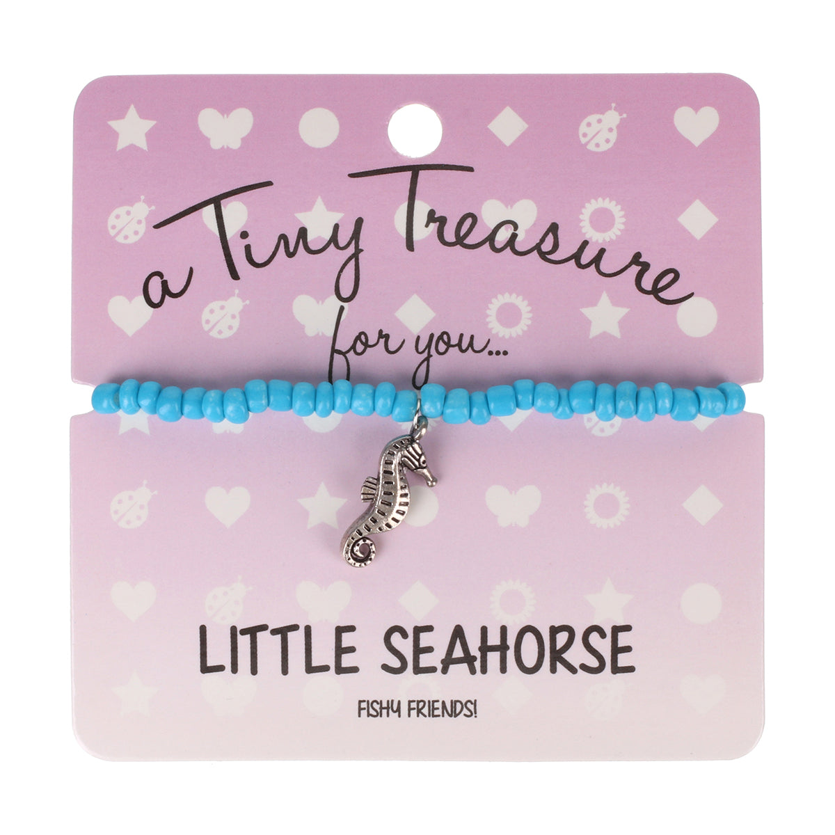 This cute 'Little seahorse' bracelet is crafted from high-quality stretchy elastic, adorned with delicate blue glass seed beads and a cute seahorse charm. Each bracelet comes with a gift card that features an adorable message - making it an ideal present for any occasion.