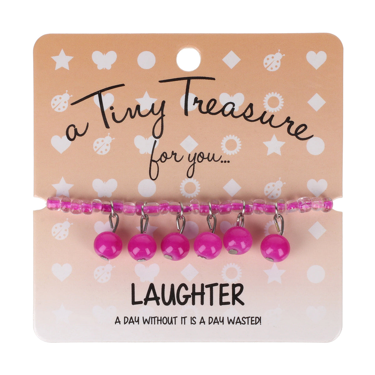 This cute 'Laughter' bracelet is crafted from high-quality stretchy elastic, adorned with delicate pink glass seed beads and cute charms. Each bracelet comes with a gift card that features an adorable message - making it an ideal present for any occasion.
