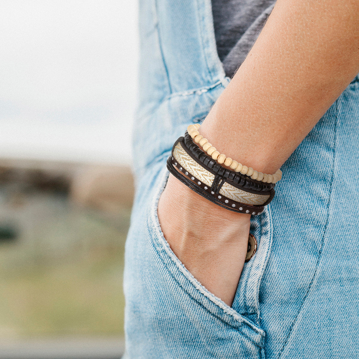 Elevate your look with our versatile stacker bracelets. Featuring a gold and white patterned bracelet, black and cream beads and multicoloured strands, these can be worn solo for a subtle touch or stacked for a bold statement. Crafted from high-quality textiles and natural materials like leather, wood and cotton, they are as sustainable as they are stylish. They are also mostly biodegradable, making them a great choice for the eco-conscious.