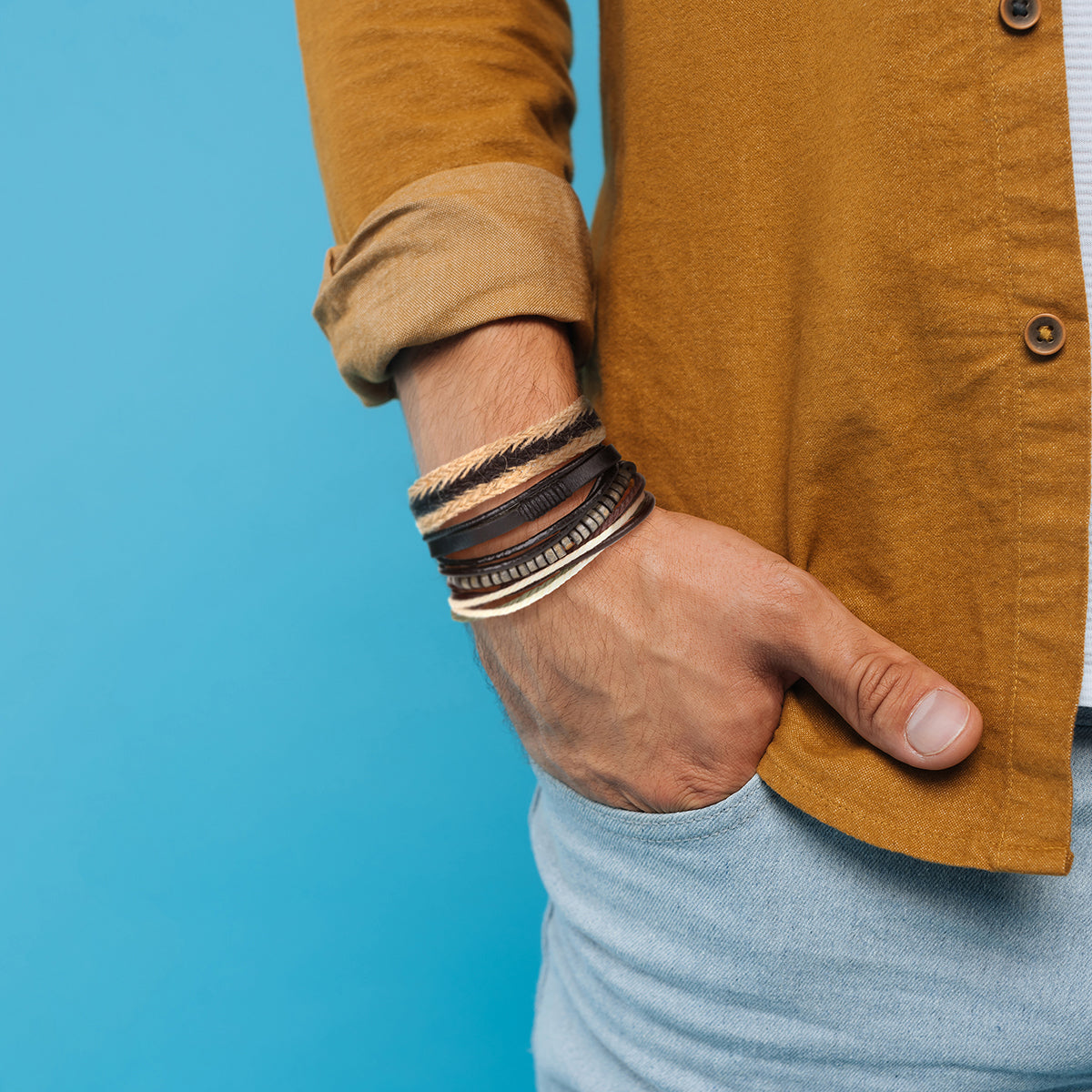 Elevate your look with our versatile stacker bracelets. Featuring black and brown strands, a chunky black and beige braid and grey beads, these bracelets can be worn solo for a subtle touch or stacked for a bold statement. Crafted from high-quality textiles and natural materials like leather, wood and cotton, they are as sustainable as they are stylish. They are also mostly biodegradable, making them a great choice for the eco-conscious.