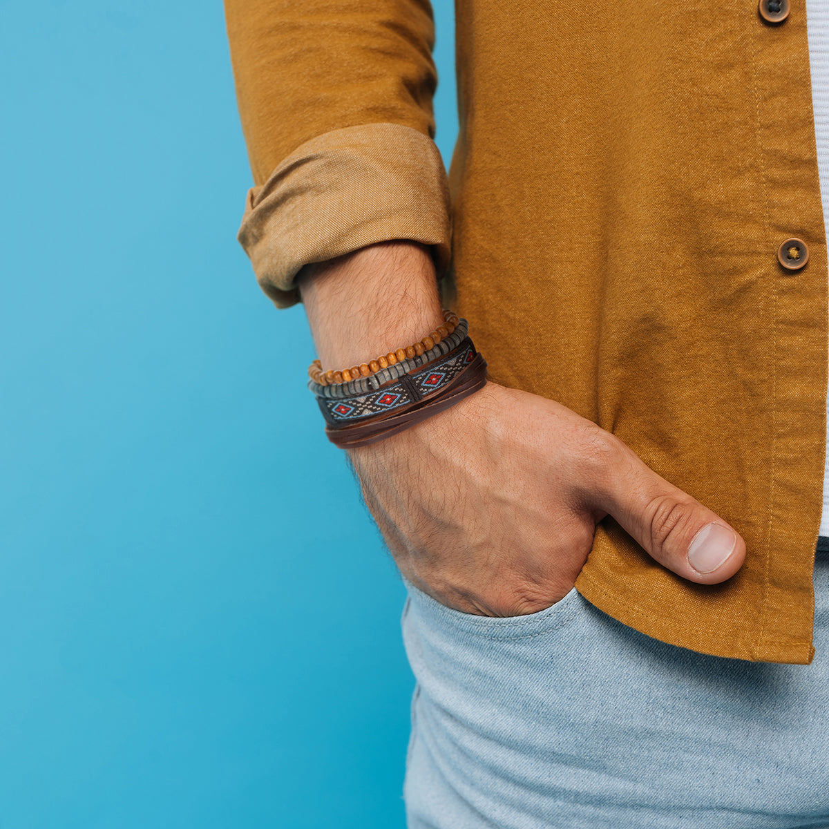 Elevate your look with our versatile stacker bracelets. Featuring a blue and red patterned bracelet, grey and brown beads as well as brown strands, these bracelets can be worn solo for a subtle touch or stacked for a bold statement. Crafted from high-quality textiles and natural materials like leather, wood and cotton, they are as sustainable as they are stylish. They are also mostly biodegradable, making them a great choice for the eco-conscious.