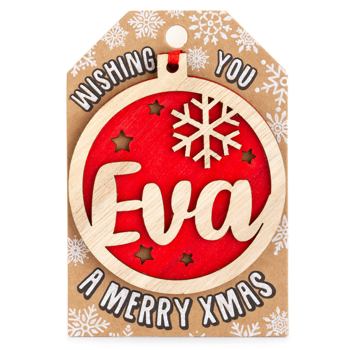 This charming wooden 'Eva' Christmas tree decoration is a thoughtful and personalised gift, ideal for stocking fillers. Each name is delicately laser-cut with precision and comes with a festive red ribbon for easy hanging. A perfect addition to vintage, rustic, or country-style Christmas decor.